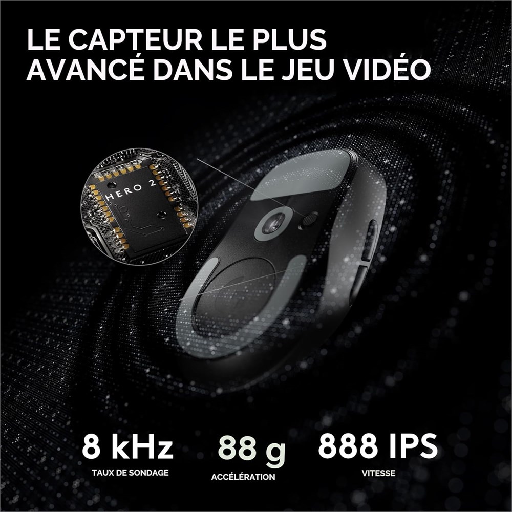 Souris de jeu sans fil rapide et pr cise : une ic ne de jeu professionnelle, maintenant plus rapide et plus pr cise ; elle est con ue en collaboration avec les principaux professionnels de l'e-sport au monde et con ue pour gagner Capteur optique de jeu le plus avanc : Le HERO 2 offre un suivi de plus de 888+ IPS, jusqu 44 000 DPI et un talonnage pr cis du capteur sans lissage, acc l ration ou filtrage Pr cision professionnelle: Les commutateurs hybrides optiques-m caniques LIGHTFORCE offrent une pr cision de niveau professionnel, une fiabilit et une action optique faible latence avec un clic tactile net Performances am lior es : Notre souris sans fil gagnante de championnat, encore am lior e ; maintenant avec une fr quence de transmission de 8 kHz, une charge USB-C, une autonomie de 95 heures (3) et une compatibilit POWERPLAY, le tout 60 g Patins de souris en PTFE sans additif : Commandez une glisse douce et une connexion sans faille votre jeu avec des patins de souris en PTFE sans additif Remarque : en cas de souris sans fil, le r cepteur USB sera fourni l'int rieur ou avec la souris.