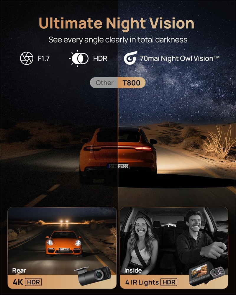 Next-Gen 3-Channel Dual 4K Dash Cam This 70mai dash cam features dual 4K (Front/Rear 3840 2160P) + 1080P Interior recording, eliminating blind spots with triple-angle coverage. Powered by dual Sony IMX678 STARVIS 2 sensors and 3-channel HDR, it delivers crystal-clear footage in any lighting bright sunlight, dark tunnels, or low-light conditions capturing license plates and key details day and night. Perfect for Uber/Lyft drivers, luxury vehicles, and legal evidence. Cinematic Clarity with Patented Imaging Technology Experience authentic 4K cinematic quality with 70mai's exclusive MaiColor Vivid+ Solution, which enhances license plates and road signs while significantly reducing glare. In single-channel mode, enjoy ultra-smooth 4K recording at 60FPS for true movie-like driving footage. This 4K 3-channel dash cam delivers court-admissible video evidence with exceptional detail and clarity. 70mai Night Owl Vision for Unmatched Night Vision 70mai s exclusive night vision cuts headlight glare and boosts clarity in urban nights. Four 940nm infrared cabin cameras auto-activates in darkness, even capturing backseat details. Ideal for night driving and ride-share safety. 24/7 Parking Guard with AI Detection This 3-channel dash cam detects collisions and suspicious activity while your car is parked, automatically recording any incidents that occur. Time-lapse recording extends recording duration by lowering the frame rate perfect for long-term parking. 70mai Lumi Vision technology delivers crystal-clear footage even in near-total darkness, revolutionizing nighttime parking surveillance in garages, alleys, and similar low-light environments. (Hardwire kit sold separately, UP06 ASIN:B0FGQJNCPL or UP03 ASIN:B09TDZ6FWZ ) 512GB Card & Loop Recording Ready to roll includes a 512 GB memory card for instant 4K recording, no extra purchase needed. Loop-recording keeps footage seamless, and the built-in G-sensor auto-locks impact clips so critical evidence is never overwritten. The triple-channel dash cam is perfect for road trips, rideshare driving, or daily commutes, preserving every moment from every angle. ADAS & Voice Control for Smarter Driving Advanced Driver Assistance System (ADAS) delivers instant alerts for lane departure, forward collision, and moving traffic, plus detects pedestrians and cyclists for safer every-mile driving. Control the 70mai 4K T800 dash cam hands-free with multi-language voice commands (EN, CN, IT, JP). Designed to integrate seamlessly into your smart-driving ecosystem. OTA Updates & Faster 5GHz/Wi-Fi 6 & GPS Enjoy OTA upgrades on app for better performance and new features. With always-on Wi-Fi delivering ultra-fast 40MB/s transfer speeds (download a 200MB video in just 5 seconds!), you can instantly access recordings via the 70mai app and share your travel highlights with friends and family on social media. Built-in GPS tracks your driving route in the app, while embedded speed stamps in videos provide extra evidence when needed.