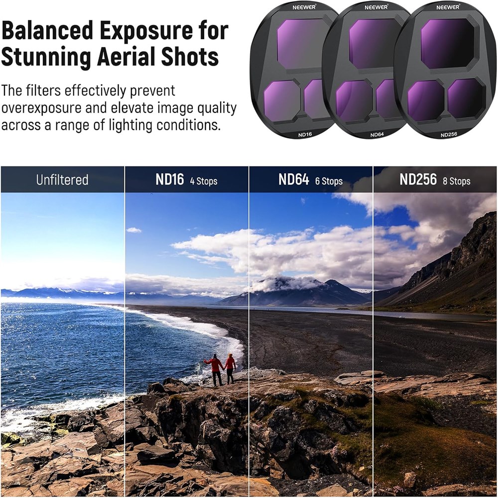 Con u pour Mavic 4 Pro : compatible avec le drone DJI Mavic 4 Pro, cet ensemble d'accessoires de filtre d'objectif comprend un CPL (polarisation circulaire) et trois filtres densit neutre ND (ND16 + ND64 + ND256) pour la photographie a rienne professionnelle et la vid ographie. Un tui de rangement magn tique portable maintient les filtres en s curit et organis s pendant la prise de vue en plein air. Id al pour les cr ateurs de contenu. Indispensable pour les influenceurs ayant un quipement de cam ra drone Contr le pr cis de l'exposition : les filtres ND16, ND64 et ND256 r duisent la lumi re de 4, 6 et 8 arr ts, respectivement. Ils peuvent pr venir efficacement la surexposition dans les environnements lumineux et ajouter un effet de flou de mouvement dynamique vos prises de vue Moins d' blouissement et de couleurs plus riches : le filtre polarisant circulaire peut liminer les reflets et l' blouissement de l'eau, du verre et d'autres surfaces non m talliques tout en am liorant la saturation et le contraste pour des couleurs vives et des d tails fins. Tournez le cadre pour obtenir les effets souhait s avec facilit Verre optique multicouche : le verre optique assure une reproduction pr cise des couleurs et une clart am lior e. Plusieurs rev tements de protection r sistent l'eau, la poussi re, aux taches, aux rayures et r duisent les reflets. Un chiffon de nettoyage est inclus pour vous aider garder les filtres impeccables Installation facile visser : (1) Tournez doucement le couvercle de protection d'origine dans le sens contraire des aiguilles d'une montre. (2) Alignez le filtre avec les fentes de montage et tournez dans le sens des aiguilles d'une montre jusqu' ce qu'il se verrouille en place. Avec 5 g, le filtre l ger avec un cadre en alliage d'aluminium ne compromettra pas l' quilibre et la performance du cardan.