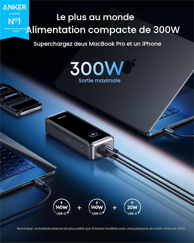 Puissance de sortie totale de 300 W : offre une sortie maximale de 300 W sur deux ports USB-C et un port USB-A, permettant deux MacBook Pro de fonctionner pleine vitesse. Charge rapide maximale de 140 W : fournit jusqu' 140 W de sortie haute vitesse pour un chargement rapide de l'ordinateur portable lorsqu'il est connect un c ble de 5 A. Chargez un MacBook Pro (M4 Pro) 50 % en 27 minutes ou un iPhone 16 Pro 50 % en 26 minutes. Recharge haute vitesse : la premi re banque d'alimentation Anker prendre en charge une puissance d'entr e maximale de 250 W en utilisant les deux ports USB-C. Se recharge 100 % plus rapidement que jamais, ce qui le rend id al pour les situations d'utilisation intensive et de rotation rapide. Puissance norme pr te l'emploi : Fournit une capacit approuv e par la TSA de 26 250 mAh (99,75 Wh) pour charger un MacBook Pro (M4) jusqu' 0,8 fois. Affichage intelligent et contr le par application : fournit des informations d taill es sur la charge de la banque d'alimentation et de la base de charge, et permet des ajustements manuels de la puissance de sortie sur l'application. Ce que vous recevez : la batterie externe Anker Prime Power Bank (26K, 300W), un c ble de charge USB-C vers USB-C de 1 m (240W), un tui de voyage, un guide de bienvenue, une garantie de 24 mois et notre service client amical. Remarque : donn es bas es sur des tests internes en laboratoire. Les performances r elles peuvent varier en fonction des conditions d'utilisation sp cifiques.