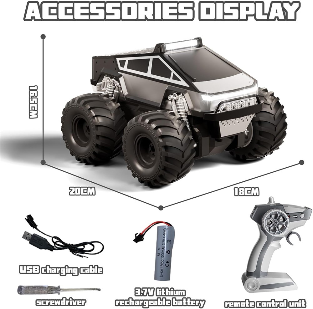 Amphibious All-Terrain Monster Truck This amphibious remote control car with an all-around waterproof wrap to ensure that the batteries won't get into the water while playing in the water, features shock absorption and high-traction, anti-slip tires to handle sand, rocks, and concrete with ease. Its waterproof design lets it glide on water like an RC boat for thrilling indoor or outdoor fun. Rechargeable Dual Lithium Batteries The remote control monster truck comes with 2PCS 3.7V 1200mAh rechargeable ternary lithium battery and a USB charging cable, and the remote control requires 2 x 1.5V AA batteries (not included). The lithium battery needs to be charged with the USB charging cable for 2-2.5 hours, and it can be used continuously for 45 minutes after a full charge. Longer game time, let your kids enjoy more racing fun. Durable & Safe Design for Kids 6+ Made of ABS materials and equipped with shock-absorbing suspension and high-traction, anti-slip tires, this amphibious RC truck powers through sand, rocks, and pavement with ease. The all-around waterproof design and high-grip rubber tires make it the ultimate adventure vehicle for any terrain or weather condition. 4WD Off-Road Capability This 4WD RC monster truck is equipped with a powerful electric motor, strong spring shock absorbers, and shock-absorbing and anti-skid rubber tires with a strong grip. The 2.4GHz control supports multiplayer racing with no signal interference, ensuring smooth and responsive handling. Race with friends and feel the thrill of speed! Perfect Birthday Christmas Gifts This remote control truck is a perfect gift for kids, and suitable for birthdays, Halloween, Christmas and other occasions. It not only develops children's interests and hobbies, but also develops operational ability, bringing joy and excitement to your kids.