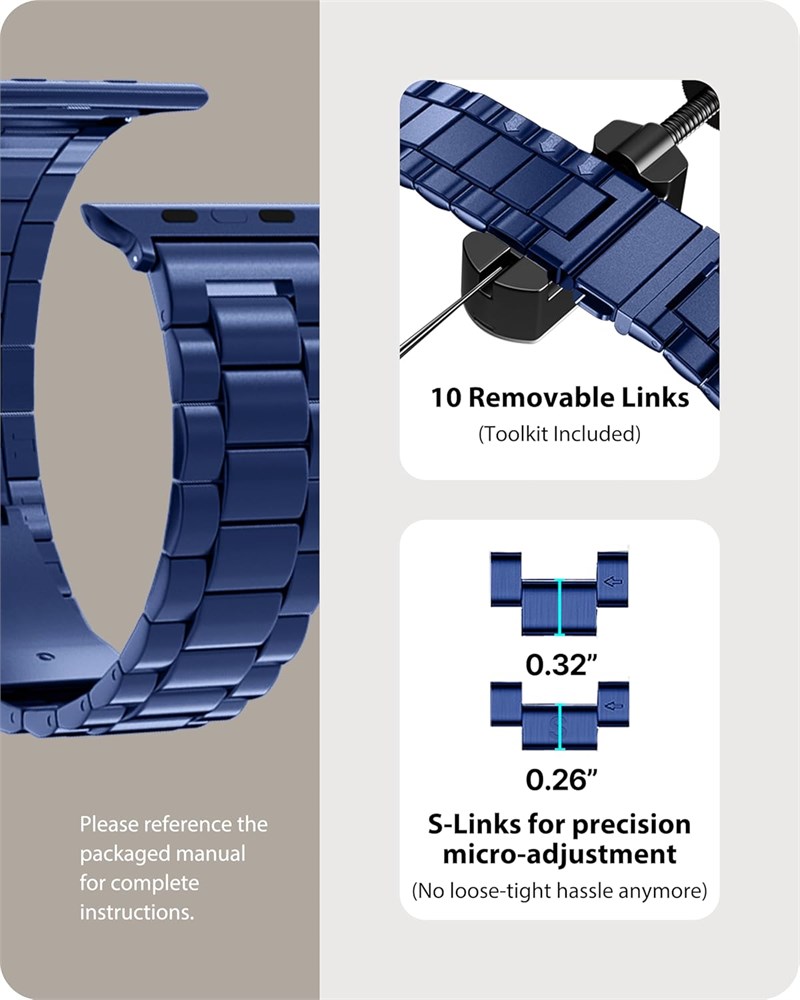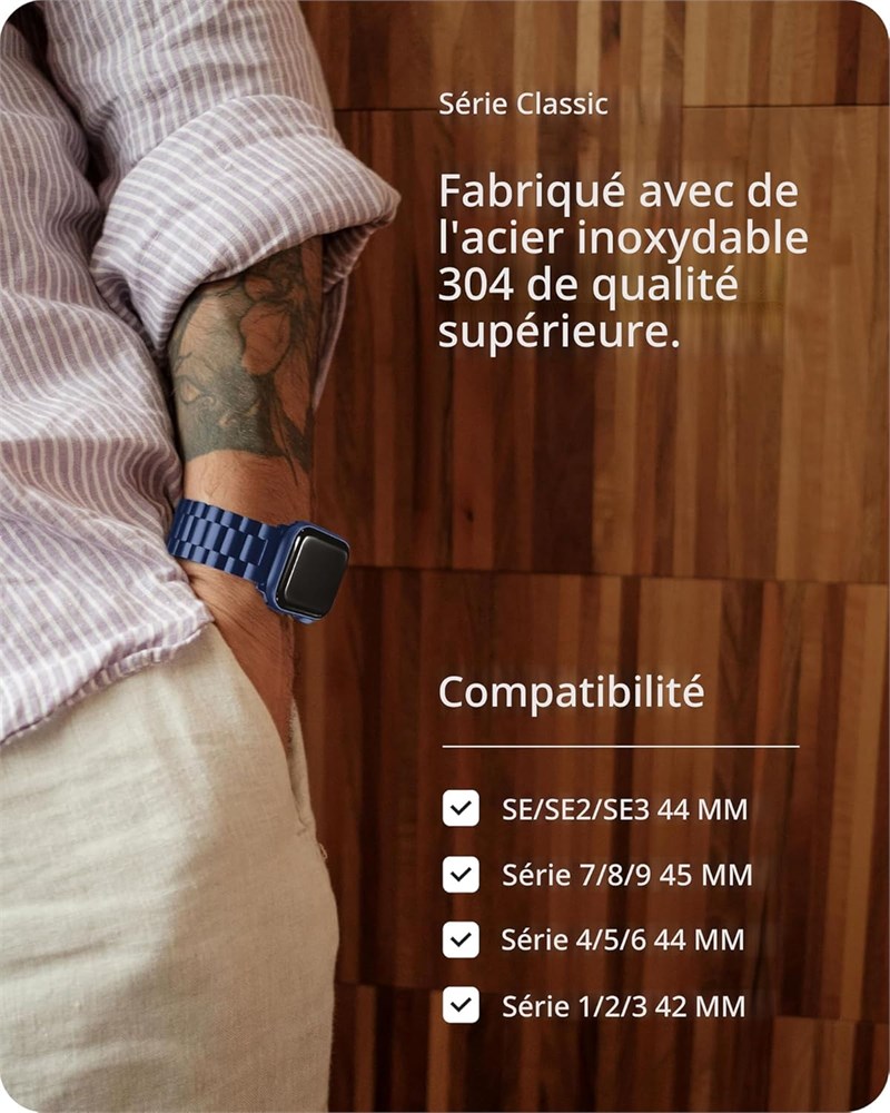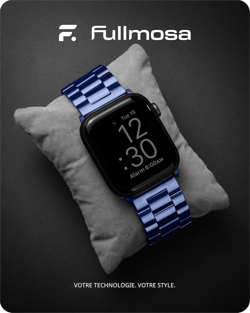 Bracelet en m tal pour Apple Watch : Compatible avec les montres Apple de 45 mm (s ries 9/8/7), 44 mm (SE3/SE2/SE/s ries 6/5/4), 42 mm (s ries 3/2/1), Apple Watch Nike+, Hermes et Edition (cadeau : une coque de protection en TPU souple pour les montres Apple de mod les SE3/2/1, s ries 9/8/7/6/5/4/3/2/1). Convient aux hommes comme aux femmes, son apparence l gante vous offre une merveilleuse exp rience Longueur du bracelet r glable pour iWatch : les maillons marqu s S sont de petits maillons pour des micro-ajustements, permettant un ajustement personnalis parfait. limination de la frustration "trop serr avec un maillon dehors / trop l che avec un maillon dedans". Utilisez l'outil inclus pour ajouter ou enlever facilement ces maillons. Confort pour chaque poignet. Le bracelet pour Apple Watch de 45 mm/44 mm/42 mm s'adapte aux poignets de 16,5 21,1 cm (v rifiez la taille de votre bo tier avant de commander) Mat riau de qualit sup rieure : Le bracelet Fullmosa pour Apple Watch est d coup et fabriqu en acier inoxydable 304 de qualit sup rieure avec une surface haute technologie, alliant luxe, noblesse et durabilit , car chaque d tail a t pris en compte dans le processus de fabrication en termes d ex cution, de conception et d esth tique Installation facile : le bracelet pour Apple Watch est con u avec un double bouton garantissant une boucle d ployante des deux c t s. Il est livr avec des connecteurs en acier raffin s, faciles enlever et installer, qui verrouillent votre montre avec pr cision et en toute s curit Ce que vous obtenez : 1 bracelet pour Apple Watch, 1 coque en TPU, 1 manuel du produit, 1 carte de contr le de qualit , 1 outil pour enlever les maillons.