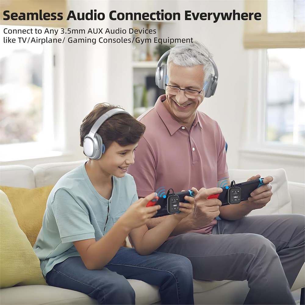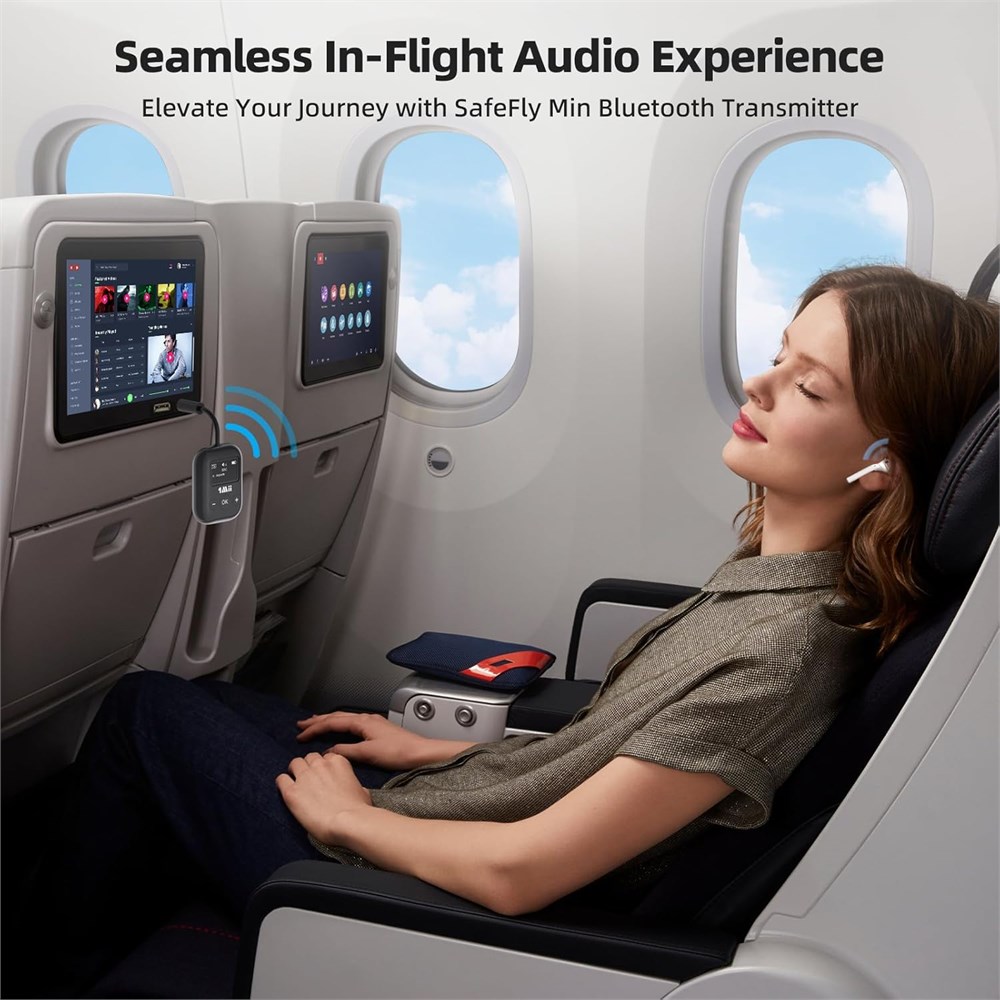 Bluetooth Adapter for Airplane The 1Mii SafeFly Min 3.5mm Bluetooth Transmitter is designed to transmit audio from in-flight entertainment systems to headphones, allowing you to connect up to two Bluetooth headphones simultaneously. Besides, this Bluetooth airplane adaptor is compatible with any audio device featuring a 3.5mm audio jack, including computers, gym equipment, gaming devices, TVs, MP3 and portable DVD players. OLED Visible Bluetooth Transmitter for TV 1Mii SafeFly Min Bluetooth Transmitter, its ease of use is unparalleled, thanks to the OLED screen that not only displays real-time battery capacity and volume levels but also shows the paired devices and audio format like SBC/aptX-HD/LL/AD. This feature eliminates all guesswork, enhancing your audio streaming experience remarkably. Low Latency High-Fidelity Audio Experience crystal-clear sound with our Bluetooth Transmitter for airplane, featuring the unique aptX Low Latency Technology. With latency reduced to less than 40ms, enjoy distortion-free audio that enhances your listening experience. This cutting-edge technology ensures seamless connectivity, especially when paired with aptX-enabled devices. Note: Your paired device must also support aptX LL for optimal performance. Long Battery Life Up to 25 hours 1Mii SafeFly Min Bluetooth adapter for TV, with just 2 hours of charging, this powerhouse delivers 25 hours of non-stop performance. Whether you're on a long flight or a lengthy road trip, our Bluetooth Transmitter will be your reliable companion, delivering uninterrupted music and podcasts throughout your journey. Bluetooth 5.3 Plug and Play 1Mii SafeFly Min airplane Bluetooth adapter features Bluetooth 5.3 technology, delivering a robust wireless signal and seamless, barrier-free transmission for up to 20 meters. Enjoy the freedom to move around freely on planes or at home, immersing yourself in wireless audio bliss. Notes It is a Bluetooth Transmitter ONLY. To ensure optimal battery life, the transmitter will automatically power off if there's no Bluetooth connection or audio stream for more than 5 minutes. Simply restart the transmitter when you're ready to use it again. SafeFly Min features advanced aptX Low Latency codecs, to avoid latency issues, make sure your device supports Bluetooth 5.3. Extra Notes Please note that our product is not suitable for hearing aids and musical instruments such as guitars and aptX mode requires the device you are paired with to also use low latency mode.