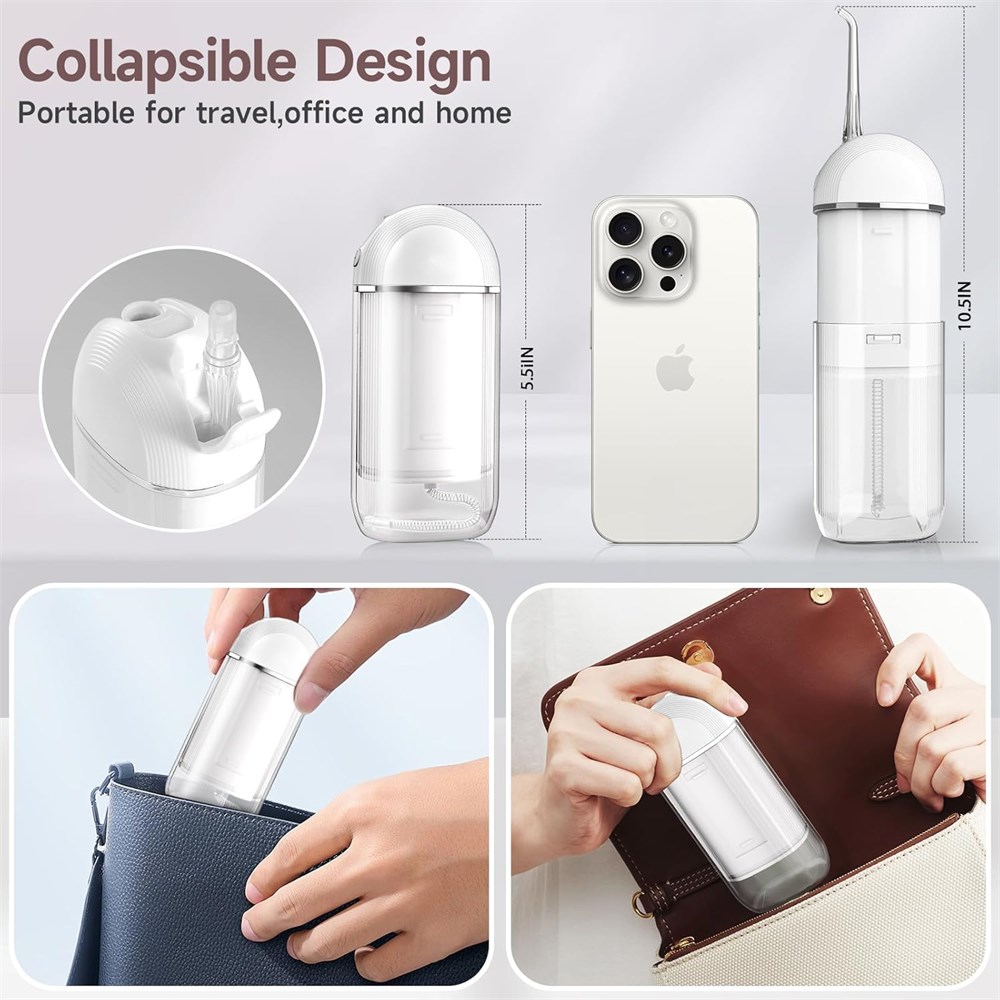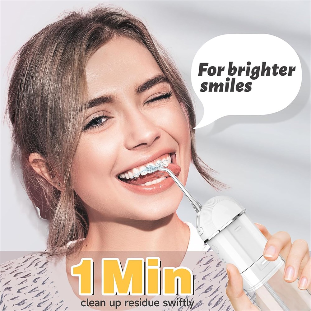 Portable Water Cordless Flosser Pick : With 1200 high-pressure water pulses per minute and a maximum of 140 PSI, this cordless water portable flosser effectively help you get rid of food particles and debris, helping you maintain a fresh and comfortable feeling. Travel-Ready Portable Flosser: Designed for travelers, this cordless water portable flosser pick lightweight and compact flosser is easy to carry wherever you go. With a powerful lithium battery, it lasts up to 30 days on a single 2-hour charge, making it perfect for maintaining a fresh feeling during business trips, vacations, or everyday use. 3 Adjustable Pressure Modes: Select from Soft, Pulse, or Strong modes to suit your needs. Whether you prefer a gentle flow or a more intense option, this portable cordless water flosser offers a comfortable, low-noise experience for all ages. 360 Rotating Nozzle & 4 Replaceable Tips: The 360 nozzle reaches every angle. It comes with 4 tips, making it a great choice for the whole family IPX7 Water-proof for Shower Use: This water portable flosser Picks is designed with IPX7 waterproofing, allowing safe and convenient use in the shower. Its durable construction prevents leaks, ensuring reliable performance with every use.