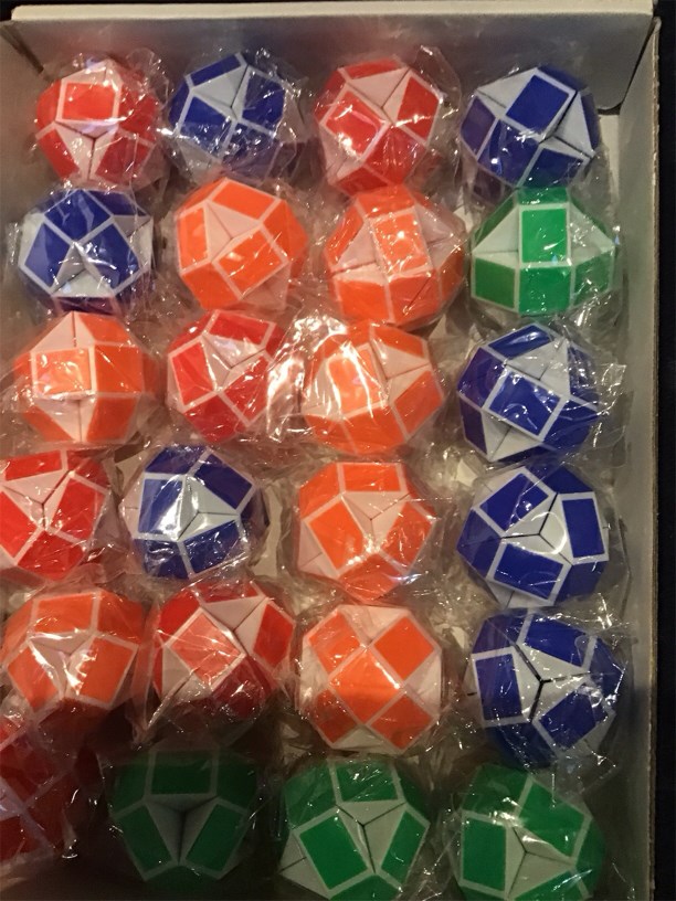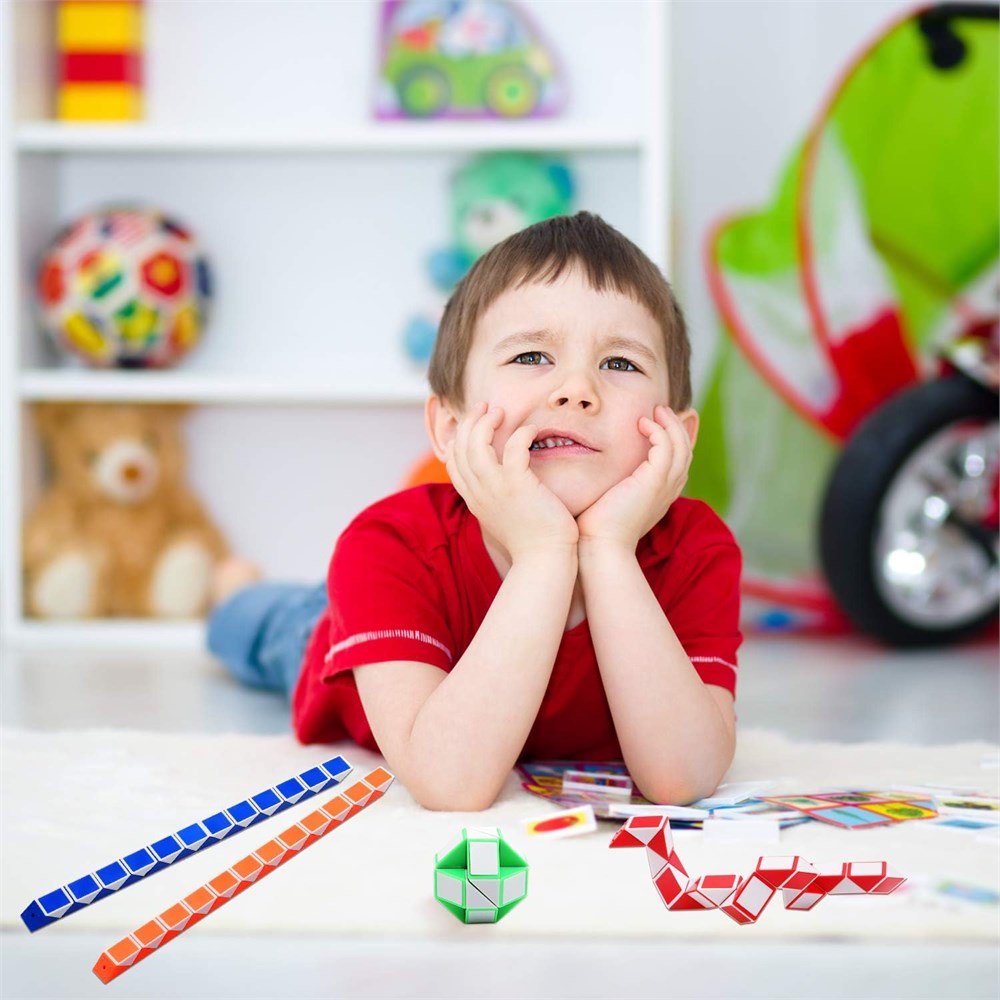 Material of magic snake cubes: this magic snake cube set is made of recyclable plastic, durable and smooth for playing, full of fun Mini snake cubes: each size of speed cube is approx. 8.6 x 0.5 x 0.35 inch/ 21.8 x 1.3 x 0.9 cm (LWH), suitable for children form 3 to 12 years old Colorful and random: these snake cubes have a lot of colors such as red white, green white, blue white, orange white and black white, they all come randomly Twist puzzle toys: you can turn it into a straight line, snake, dog, stair or other imaginative shape by rotating the triangle blocks of snake cubes, bring challenges and fun to your fingers and brain Package include: 24 x magic snake cubes, good for kids' intelligence and imagination development, great as gifts for kids, party bag fillers or party supplies.
