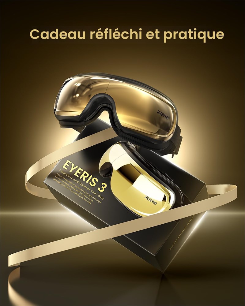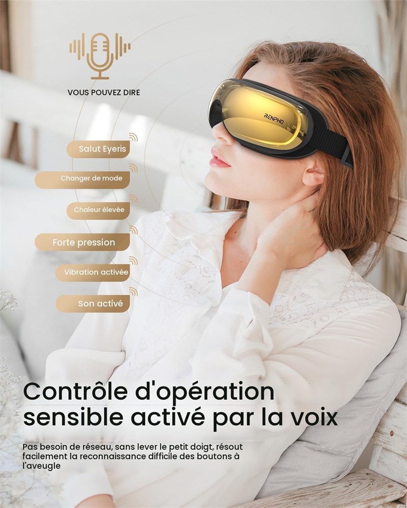 Fonctionnement am lior commande vocale : R volutionnez votre exp rience avec la facilit du contr le vocal. Avec un vaste r pertoire de 18 commandes vocales - le tout sans lever un doigt - vous permettant d'ajuster facilement vos param tres, le masseur oculaire RENPHO EYERIS 3 adopte un p trissage am lior pour la relaxation des yeux. Am liorez votre exp rience avec la commodit suppl mentaire des options de diffusion vocale ou de mode silencieux Masque chauffant avec gel rafra chissant amovible : Profitez de 3 niveaux de chaleur variable de 40 45 C (104 113 ) pour mieux soulager les gonflements des yeux, les yeux secs, etc. Le masque en gel rafra chissant amovible peut tre plac au cong lateur pendant 35 60 minutes et attach l Eyeris 3 pour procurer une sensation de fra cheur qui peut efficacement vous aider vous rafra chir apr s une longue journ e de travail ou d tude Design r glable 180 et portable : notre masque de soins oculaires peut tre pli en un plus petit, de sorte que vous pouvez l'emmener au bureau, en avion, en voyage. En outre, le bandeau peut tre facilement ajust en taille et convient tous les adolescents et adultes. Remarque 2 : Si le bandeau vous semble trop serr ou trop l che, veuillez l'ajuster pour trouver la bonne taille. Performance et fonction m moire am lior es : personnalisez librement vos pr f rences partir de l'un des modes disponibles et cr ez une exp rience vraiment unique. Les boutons tactiles am lior s permettent une accessibilit fluide. Rappelez sans effort vos modes personnalis s gr ce la fonction m moire pratique. tandis que le mat riau PU facile nettoyer assure une utilisation s re et confortable Compatibilit Bluetooth et charge rapide : la musique int gr e am liore la relaxation et peut tre d sactiv e votre guise. Profitez d'une ambiance apaisante gr ce la connectivit musicale Bluetooth. L'appareil de soin des yeux Eyeris 3 est aliment par une batterie rechargeable int gr e de 1500mAh, qui ne n cessite que 1,5h pour tre compl tement charg e. L'indicateur de charge LED affiche le niveau de charge avec une lumi re rouge lorsqu'il est branch . Profitez de la libert d'utilisation de la machine pour les yeux Cadeau id al pour tous : si vous avez encore du mal avec des id es cadeaux, faites d'un masque chauffant pour les yeux l'option de choix pour offrir en cadeau Eyeris 3 est un cadeau d'anniversaire pour hommes/femmes, un cadeau pour la famille, et un bon choix de cadeau pour la f te des M res/des P res, les vacances, ou l'anniversaire.