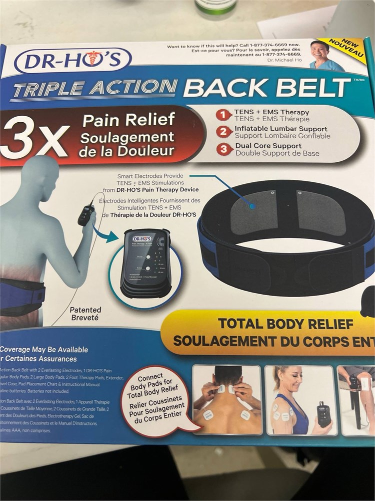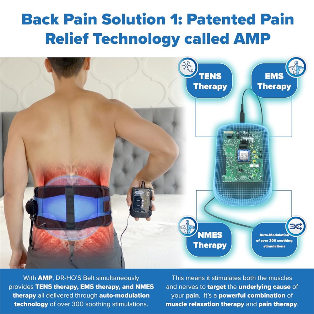 Essential Package This package includes the Triple Action Back Belt, Pain Therapy Device, regular and large body pads, foot therapy pads, pain relief spray, electrotherapy gel, and travel bag. Triple Action Pain Relief Combines TENS, EMS, and AMP technology for multi-layered pain relief, helping reduce discomfort, improve circulation, and ease muscle tension in the lower back. Inflatable Lumbar Support Features a built-in inflatable cushion to relieve lower back pressure and promote spinal alignment, ideal for chronic pain, sciatica, and muscle strain relief. Dual-Core Compression Provides firm core and back stabilization to reduce strain, support better posture, and make daily activities easier on the spine and core muscles. Ideal for Daily Discomfort Provides support for chronic back pain, arthritis, disc conditions, and posture, suitable for active lifestyles, sports recovery, and age-related discomfort.