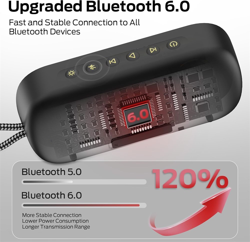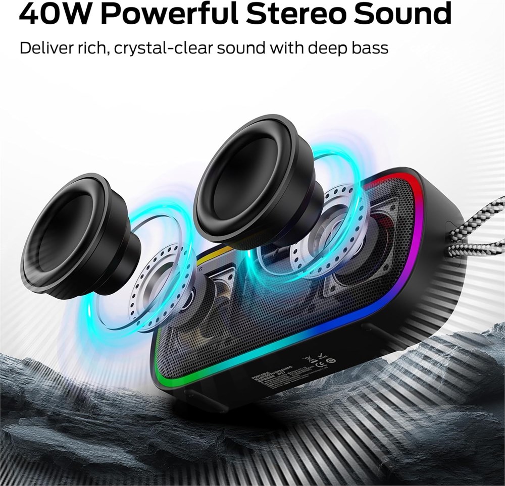 40W Powerful Audio + Dynamic RGB Light Show: Dual drivers deliver crisp highs and punchy bass (40W output), while customizable RGB lights sync to your music's beat - perfect for parties, workouts, or mood lighting. IPX7 Waterproof - Brave Any Adventure: Built to survive splashes, rain, or even accidental submersion (up to 1m/30 mins). Take it to the beach, pool, or kayaking without worry. Bluetooth 6.0 + Triple Playback Options: Stable, low-latency wireless via BT 6.0, or use TF card (128GB max), AUX-in connections. No music left behind! Sound Matrix Sync with100+ Speakers: One phone to rule them all-seamless control over100+, speakers for any occasion, big or small! Set a "S150 Plus" as the main audio when under Bluetooth broadcast mode, and connect 100+"S150 Plus" sub-audio to control its functions. You can turn off all the audio and adjust the volume by controlling the main audio. Anti-Loss Strap for On-the-Go Freedom: The reinforced hang strap lets you clip it to backpacks, bikes, or shower hooks. No more juggling Just grab it and go! Built-in Mic for Hands-Free Calls: Take conference calls or chat outdoors with the noise-reducing microphone. One-touch answer/end calls without grabbing your phone.