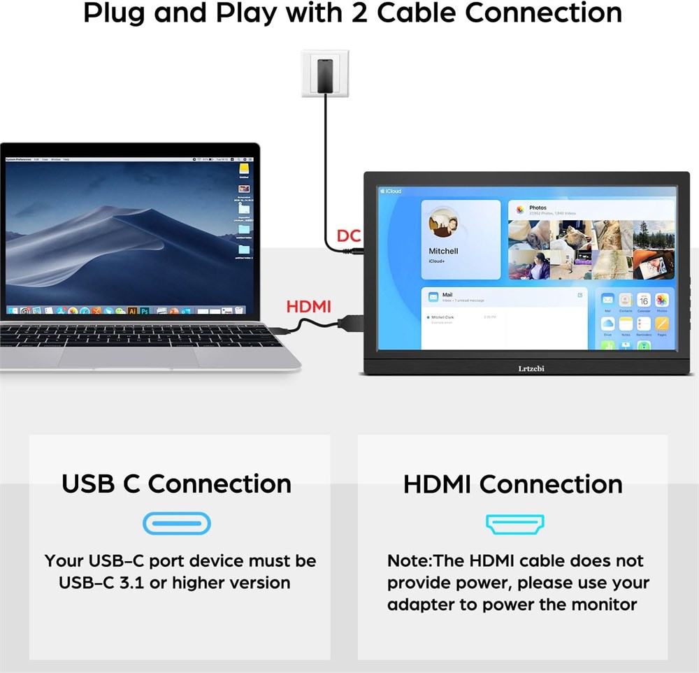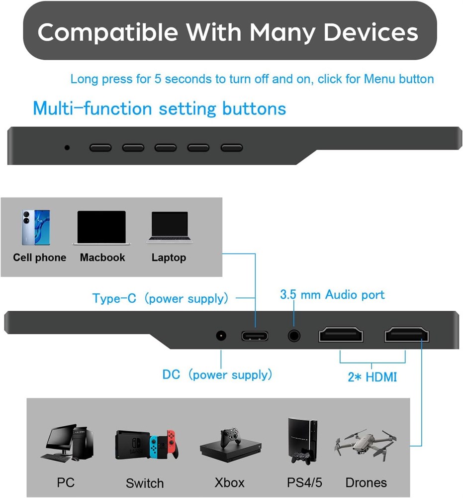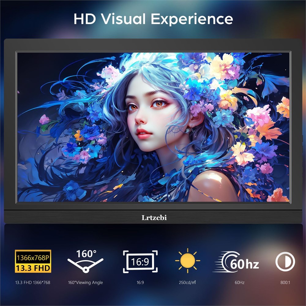 Moniteur portable HD : le moniteur portable de 13,3 pouces a une r solution de 1366 x 768p, un rapport de contraste de 800:1, une luminosit de 250 nits, un rapport d'aspect 16:9 et un angle de vision de 160 , ce qui fournit une image claire et nette, vous permettant de profiter d'une exp rience visuelle de qualit dans n'importe quel environnement. Interface multifonctionnelle : le petit moniteur HDMI est quip de deux ports HDMI, d'un port DC, d'un port audio de 3,5 mm et d'un port d'alimentation de type C, ce qui rend ce moniteur portable compatible avec une large gamme d'appareils, tels que PS4, Xbox, Switch, PC, ordinateur portable, offrant des options de connectivit flexibles. Deux haut-parleurs int gr s : le moniteur portable dispose de deux haut-parleurs int gr s pour ajouter un support sonore votre exp rience de visionnage de films ou de jeu, non seulement pour voir de superbes images, mais aussi pour entendre un son clair. Et il prend en charge l'orientation paysage et portrait pour vous apporter une exp rience plus riche. L ger et portable : le design compact et fin et le support r glable int gr rendent ce moniteur portable tr s appropri pour une utilisation mobile, le support int gr est pratique pour vous permettre de l'installer rapidement dans diff rentes occasions, tout moment, n'importe o pour r pondre aux besoins du travail ou du divertissement. Montage VESA (les trous de montage sont de 75 x 75 mm) VESA non inclus. Remarque : le c ble CC (12 V) et le c ble USB C (5 V) ne peuvent pas tre connect s en m me temps. Cela peut endommager l' cran. Veuillez nous contacter si vous rencontrez des probl mes pendant le processus.