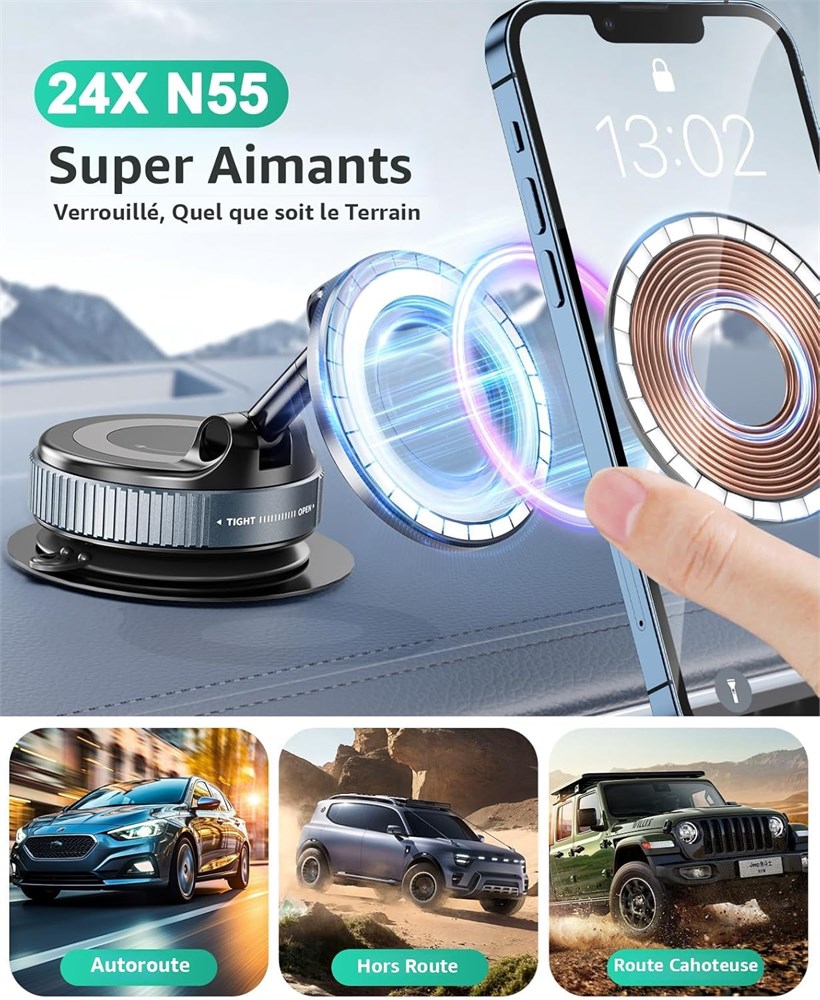 Rotation 360 et ajustement double axe Ce support de t l phone magn tique rotatif pour voiture est dot d une rotule 360 et de bras m talliques pliants double axe de 210 . Que vous pr f riez le mode portrait ou paysage, le support de t l phone magn tique peut r pondre vos besoins. L'amplitude de mouvement est excellente, assurant des angles de vue optimaux pour la navigation, les appels ou la lecture multim dia. Le bras pivotant permet d'ajuster le t l phone dans n'importe quel angle, peut tendre ou r tracter le bras en fonction de l'utilisation du conducteur. Forte aspiration avec am lioration manuelle de torsion Ce support t l phone magn tique vide pour magsafe avec aspiration sous vide rotative am lior e et m canisme de verrouillage torsion, permettant un fonctionnement mains libres sur diverses surfaces lisses. Il suffit de verrouiller par torsion et il sera aspir . La ventouse nano gel 4 couches haute r sistance supporte jusqu' 30 kg et tient fermement dans des temp ratures extr mes (-40 C 150 C). Parfait pour l'enregistrement vid o ou la prise de photos. M me sur des routes cahoteuses ou lors d'un arr t brusque lors de l'utilisation de la navigation, le t l phone reste fermement en place. Veuillez coller le disque m tallique sur la surface non lisse avant utilisation R sistance magn tique et s curit du t l phone Le t l phone magn tique pliable vide avec 22 aimants N55 haute performance, se fixe sur le support avec un clic satisfaisant et reste fermement en place, m me sur les routes cahoteuses, sans vacillement ni glissement, vous donnant confiance en la s curit du t l phone. Cette connexion magn tique robuste est essentielle pour la navigation et les appels mains libres pendant la conduite. Pour les t l phones Android sans MagSafe, il faut fixer l'anneau m tallique. Large application : le support de t l phone magn tique ventouse dispose d'une ventouse am lior e la base avec la derni re technologie d'adsorption sous vide. Il suffit de tourner le cadran pour le fixer en toute s curit toute surface lisse, telle que les pare-brise, les crans de tableau de bord ou les fen tres lat rales. M me sur les routes cahoteuses, le support de t l phone pour voiture reste fermement en place. Remarque : Avant l installation, veuillez essuyer la surface de montage et la ventouse la base du support pour vous assurer qu ils sont propres, secs et sans poussi re pour une puissance d aspiration maximale Maintien magn tique puissant, compatible avec les signaux et compatible avec les coques : le support de t l phone magn tique vide garantit un GPS, des signaux et une charge ininterrompus, ce qui le rend parfait pour la navigation et le chargement en d placement. Son aimant puissant maintient solidement les t l phones plus grands et est compatible avec la plupart des coques de t l phone d une paisseur maximale de 5 mm (0,02 pouces), bien que les cartes de cr dit dans les tuis doivent tre retir es. Il est tr s l gant et compact, occupant un minimum d'espace sur le tableau de bord. Support T l phone Universel Ce support magn tique pour t l phone de type aspirateur vide pour voiture 2025 fonctionne non seulement avec iPhone 16 Pro Max/Pro/Plus/16/15 Pro Max/Pro/Plus/15/14 Pro Max/Pro/Plus/14/13 Pro Max/Pro/13/mini/12 Pro Max/Pro/12/mini/11 Pro Max/Pro/11/XS Max/XS/XR/X/8 Plus/8, mais aussi compatible avec Samsung Galaxy S22/21/20/10/9/8/7/6, Note 20/10 Plus, A71/51/50/10 mod les, et toutes les autres marques de smartphones. De plus, le support de t l phone pour voiture est compatible avec les coques MagSafe et les coques de t l phone magn tiques d'autres marques.