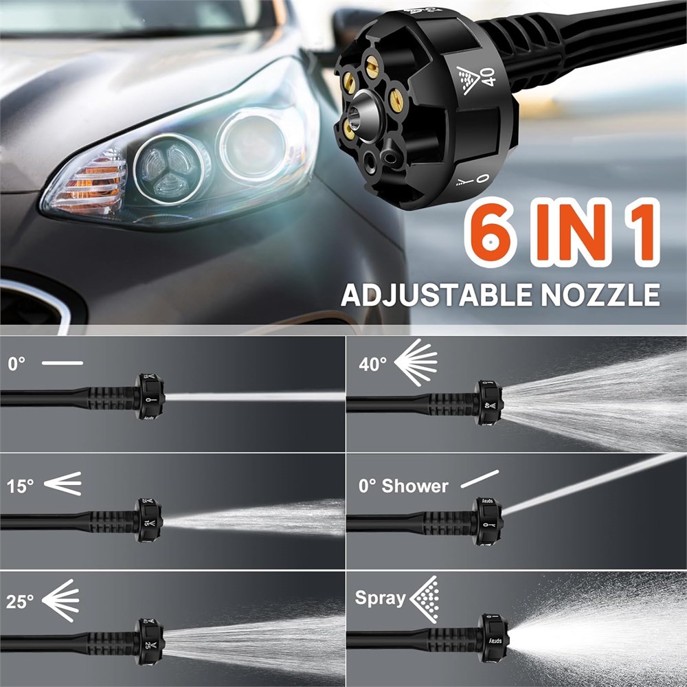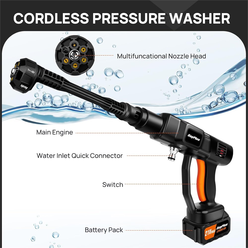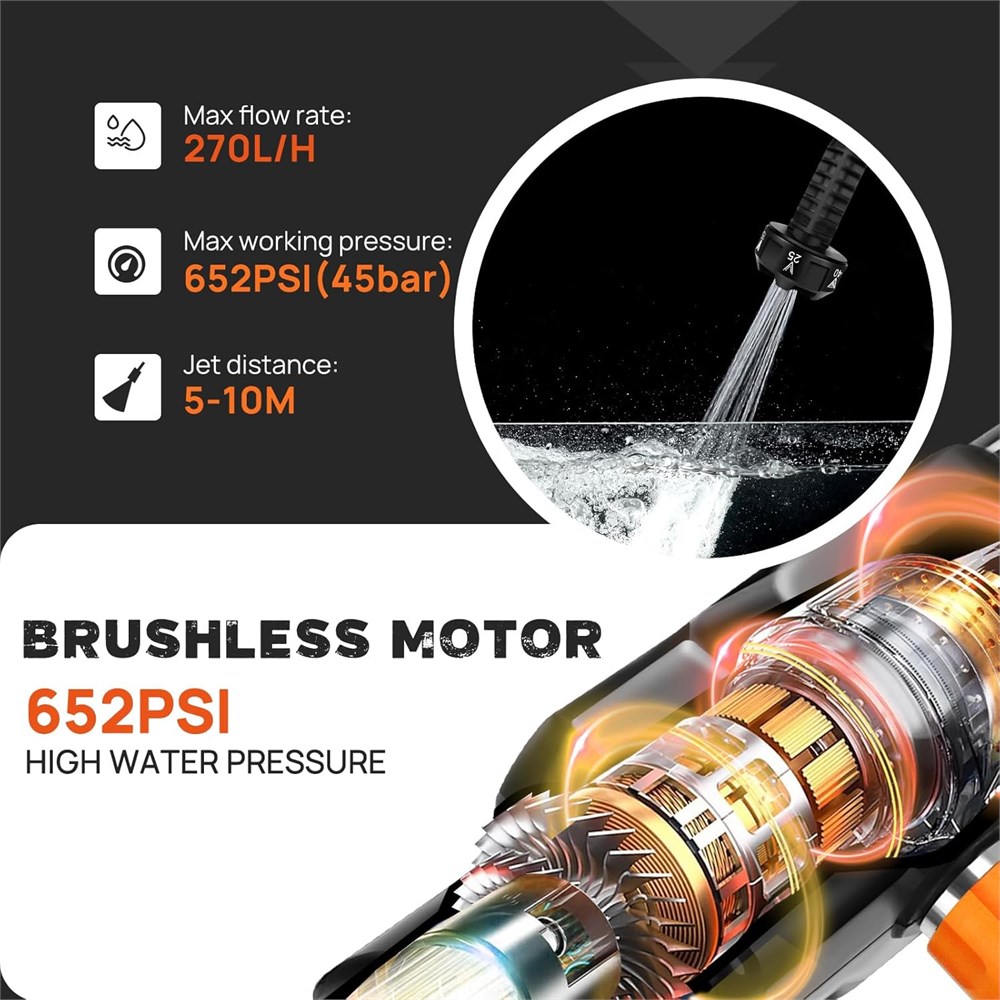 Powerful Pressure Washer --- Cordless Power Cleaner offers a powerful 652 PSI motor capable of spraying up to 270L/H. It is a truly portable power washer that allows you to clean all your outdoor spaces and equipment easily and quickly.ure copper brushless motor low noise, high efficiency, can be faster cleaning. 21V Battery Powered & Fast Charger --- The portable pressure cleaner features a high-performance 3.0 Ah battery, providing long-lasting power and dependable performance. This 21V battery allows you to use the pressure washer for up to 45 minutes on a single charge. Ideal for both DIY enthusiasts and professionals, the pressure cleaner is a smart investment that lets you get more cleaning done in less time. MULTIFUNCTIONAL 6-IN-1 NOZZLE --- The nozzle for 0 /15 /25 /40 /0 shower/Spray mode. It's great for watering plants, cleaning vehicles, gardening tools, bikes, boats, windows, walls, floors, baths, swimming pools, doors, driveways, fences, and corners that are difficult to clean manually. The pressure washer is equipped with a foam pot for quick foaming, which is easy to clean cars and clean stains such as windows and doors. Multiple Water Supply --- The 16.4ft hose with filter basket can effectively filter impurities such as particles. Its self-priming function can suck water from buckets, pools, rivers, etc, which will save a lot of water and working time, better protect our pressure machine. Best choice for outdoor use. What You Get --- Cordless pressure washer kit come with 1x Pressure Washer Body, 1x 3000mAh Battery, 1x Fast Charger, 1x 6-IN-1 Nozzle, 1x 16.4ft Hose, 1x Hose Connector, 1x Connector, 1x Soap Bottle, 1x Water Filter, 1x Carry Bag, 1x User Manual. Warming ---We have to give our customers the best buying experience, so we test every pump before we ship, if there is water coming out of the cordless pressure washer pump, Don't worry, it's due to the water we retained during the test. When using Water Bottle there will be air pressure, so we made a ventilation hole at the Connector, this hole may have a little leakage water in the process of use, this is a normal phenomenon.
