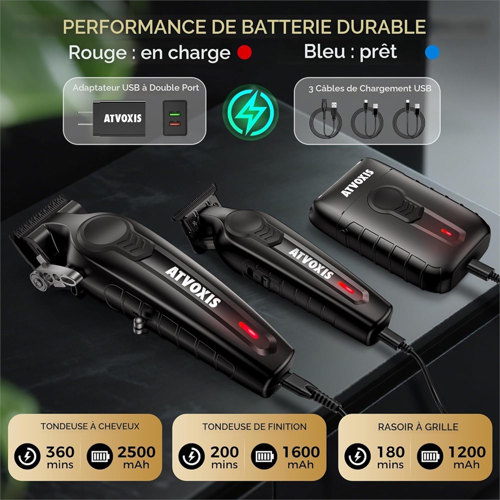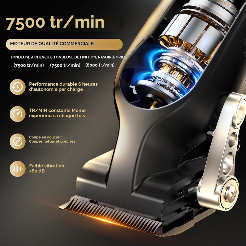 LAME "DLC" 3 FOIS PLUS A GU : Les lames ultra-aig es de notre tondeuse et de notre taille-barbe sont dot es d une technologie de rev tement en carbone semblable au diamant (DLC). Ce rev tement avanc offre une nettet et une durabilit 3 fois sup rieures, permettant aux lames de glisser en douceur et sans effort travers tous les cheveux pais et denses. Con u pour r sister la corrosion, r duire la friction et maintenir des temp ratures plus fra ches. Les lames rev tues DLC garantissent non seulement des r sultats de qualit professionnelle, mais transforment galement chaque coupe en une exp rience de luxe. MOTEUR BEAST-UNE PUISSANCE INARR TABLE : Notre ensemble de coiffeur est quip de moteurs couple lev d livrant 7 500 tr/min constantes sur la tondeuse et la tailleuse, et 8 000 tr/min constantes sur le rasoir. Avec la puissance de moteurs robustes, ces machines de coupe de cheveux prouv es par les barbiers coupent tous les types de cheveux sans se bloquer ni se coincer. Nos ing nieurs ont pass des ann es rechercher et concevoir ces 3 outils pour une coupe de cheveux sans interruption, offrant une performance in branlable pendant des sessions prolong es. 360MIN+200MIN+180MIN DE LIBERT SANS FIL & BASES DE CHARGE : Notre ensemble de coupe de cheveux est con u pour la tonte tout au long de la journ e : la tondeuse fonctionne pendant 360 minutes (6 heures), le taille-barbe pendant 200 minutes (3,3 heures) et le rasoir pendant 180 minutes (3 heures) avec une seule charge. De plus, les bases de chargement garantissent que la tondeuse et la tailleuse sont toujours pr tes l emploi, fournissant une puissance compl te du premier au dernier coup. Toujours pr t au combat, n'attendez jamais. PEIGNE MAGN TIQUE CODE COULEUR : Obtenez des d grad s impeccables et un m lange sup rieur avec notre syst me de peigne efficace. Le tondeur comprend 8 peignes magn tiques cod s par couleur (1/50", 1/16", 1/8", 1/6", 1/4", 3/8", 1/2", 5/8") et un levier de d grad 4 positions, couvrant les styles allant des d grad s la peau aux coupes textur es. Trois peignes de tondeuse de pr cision (0,4 mm, 1,6 mm, 3,2 mm) assurent des lignes de cheveux et des d grad s de barbe nets. Notre code couleur intuitif rationalise le style, ce qui permet d' conomiser une heure par jour. Kit tout-en-un prouv par le barbier : m me investissement, 2 fois plus d'outils professionnels 23 en 1 : 8 peignes magn tiques code couleur, 3 peignes d taill s code couleur, un peigne coiffant de taille normale, un flacon d'huile pour lame de 52,7 g (plus de 500 coupes), une brosse de nettoyage en profondeur, 3 c bles de charge, un chargeur USB double port, 2 supports de charge, un tui de rangement et un emballage cadeau de luxe. Compl tude ultime sans compromis pr t pour les barbiers cr atifs du monde entier!