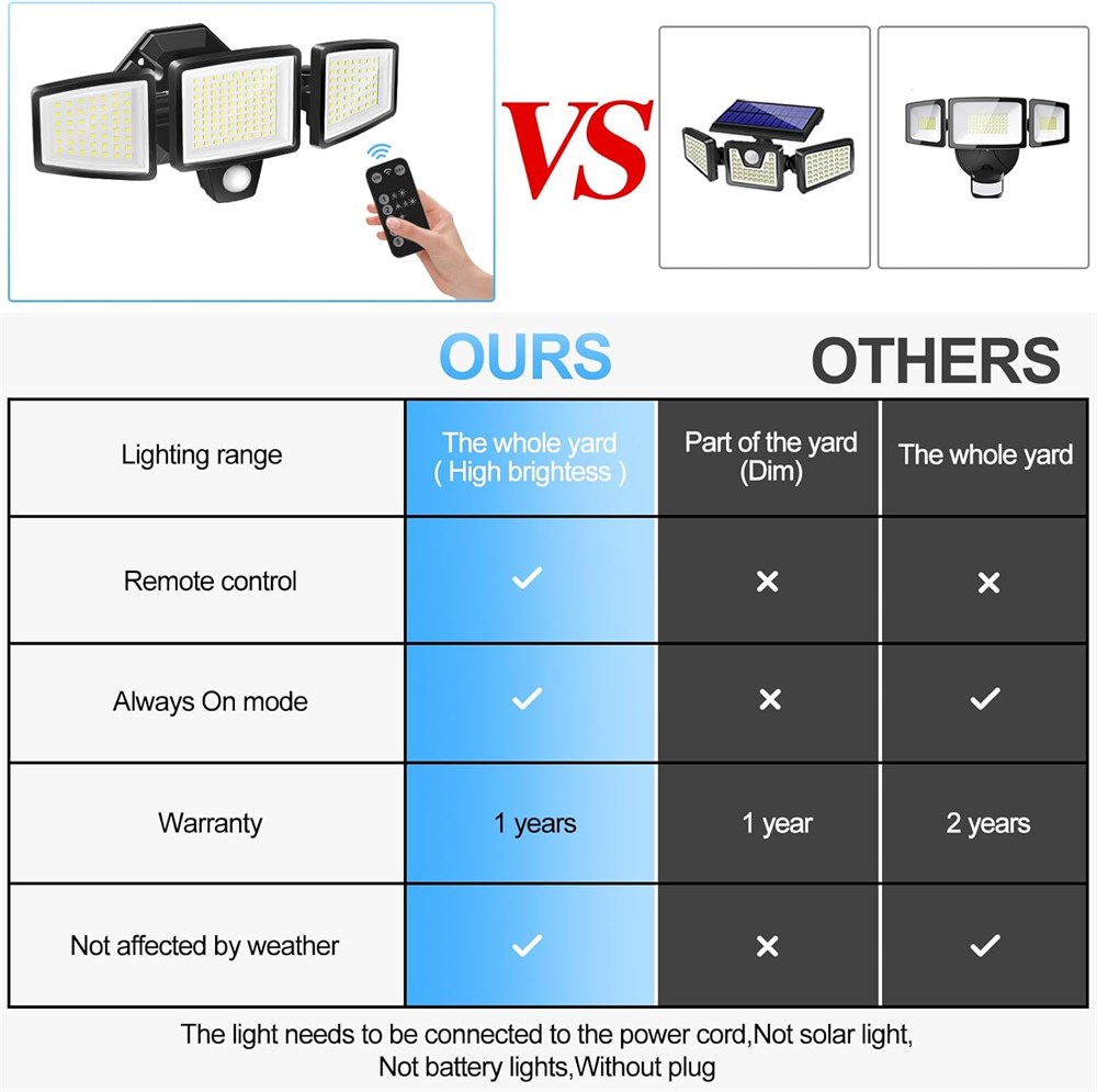 Super Bright Hardwired Security Light The light needs to be connected to the power cord, with Always ON mode. Not solar light, Not battery lights. This is a super bright LED motion sensing security light. Although only 15 watts, the brightness is equivalent to 150 watts of traditional halogen bulbs, and you only need one to light up the garage, backyard, or even the entire yard. You will be pleasantly surprised by its brightness when you receive it. Convenient remote control function Compared with other outdoor lights in the market, this outdoor flood light has a remote control function, the remote control is very simple and easy to use. You can easily change the lighting mode, save the trouble of climbing ladders, very convenient. 5 night lighting modes Mode 1 When people pass by, it is very bright; Mode 2: When people pass by, low brightness becomes very bright; Mode 3: Always on (micro brightness); Mode 4: Always on (medium brightness); Mode 5: Always on (high brightness). This can meet your needs at different times. Better Security Lights for Canada Compared with solar flood lights, this outdoor light is more suitable for Canadian winters, it is powered by the power cord, and the lighting time is not reduced by the climate. And this product is made of low temperature resistant material, this lamp can withstand temperatures from -40 C to 0 C, and it is suitable for long-term use in extremely cold regions. You don't have to worry about its lifespan at all.