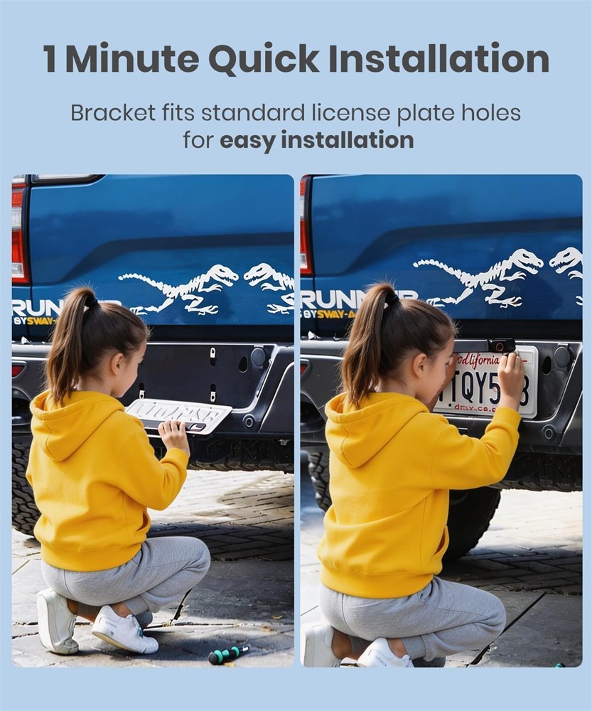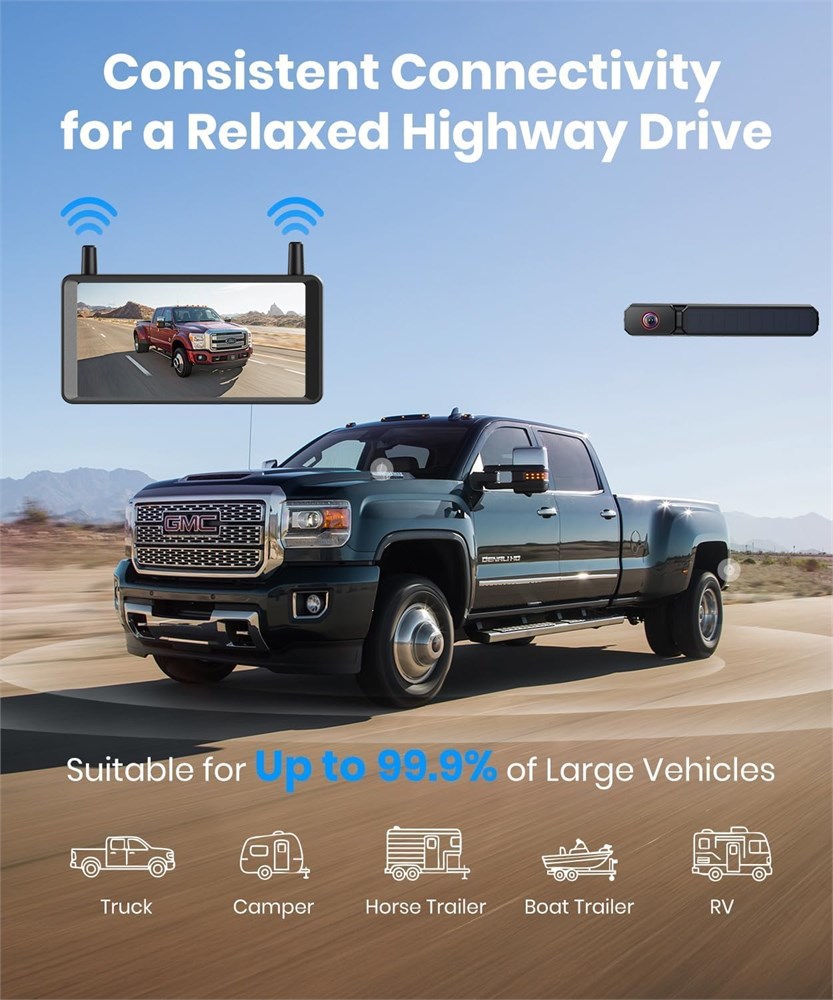 Perfect 6 Inch Widescreen for Easy Viewing: This monitor is the ideal size to see everything clearly without squinting and it is compact enough to keep your dashboard area clean. The 16:9 widescreen layout matches how your eyes naturally see, making your wireless backup camera with monitor much more comfortable to use while reducing eye strain during parking Dual Antennas for Enhanced Signal Strength: Compared with typical 5 inch single antenna systems, the dual antenna design delivers a smoother, steadier connection while driving, helping keep the wireless backup camera for trucks' view stable with less lag, stutter, or dropouts.That difference shows up in the moments that matter, cruising on the highway, passing trucks, merging, or moving through busy roads when you want the image to stay clear and responsive Solar Assisted Power for Longer Runtime: The built in solar panel helps extend the camera s battery runtime during daylight.The solar wireless backup camera stays on standby and is ready whenever you want to check the view. Just press the button on the power cord to bring the image up instantly 2 Minute DIY Install, No Wiring Required: No wiring, no drilling, and no need to connect to vehicle lights. Save time and save installation costs. Simply use a screwdriver or the included 3M adhesive to adjust the reverse camera to your preferred angle, mount it on the license plate, and secure it with the anti theft screws Clear 1080P View with Color Night Vision: High definition 1080P video gives you a sharp, accurate view to better judge distance and avoid misjudging curbs, posts, and obstacles when backing up. In low light situations, the car backup camera wireless delivers a clear color image instead of a blurry black and white view, helping you spot small or low lying objects that standard mirrors often miss Built In DVR Records Automatically: The system starts recording as soon as the monitor is powered on to help you keep a record of your drives. This back up camera systems for truck uses loop recording to save over the oldest footage automatically, though please note that a micro SD card is required and not included Technical Guidance and Product Support: We provide clear instructions and helpful resources to ensure your back up camera works perfectly from day one. If you have questions regarding solar charging or camera syncing, our team is available to provide technical troubleshooting and feature support.