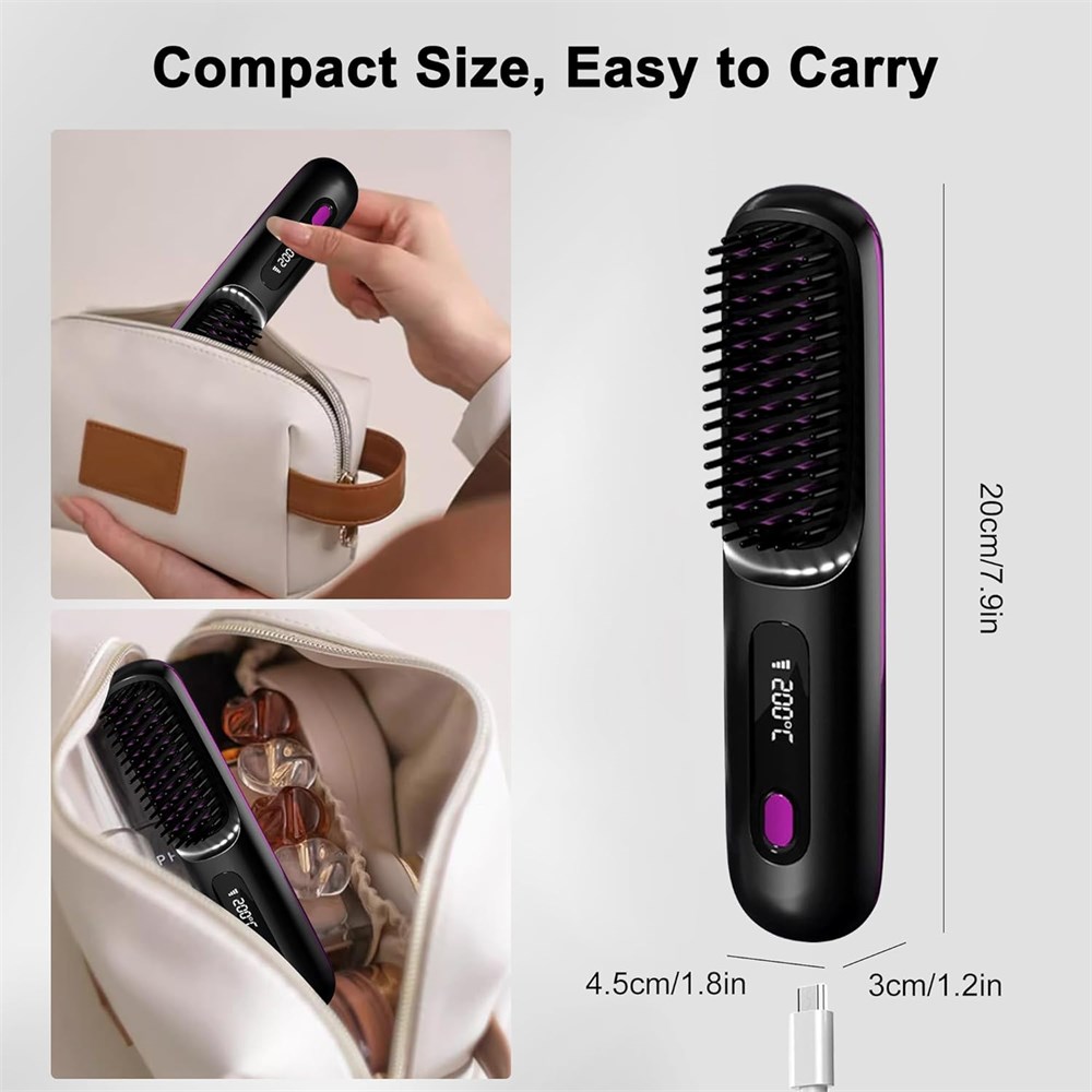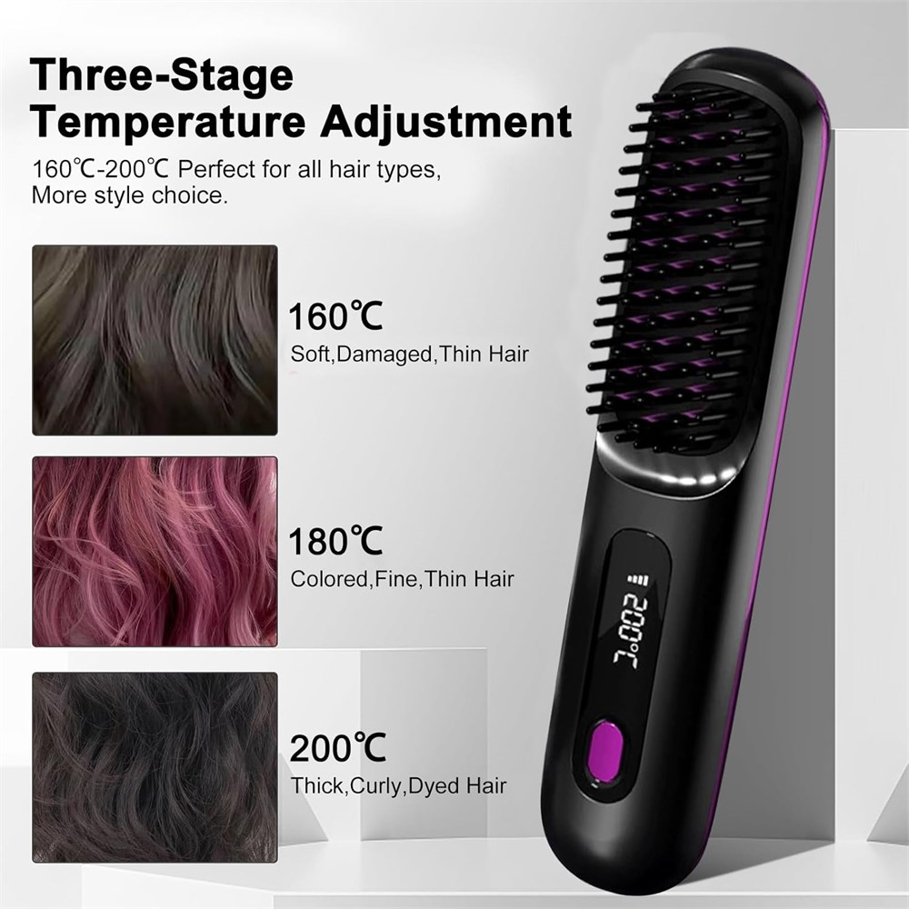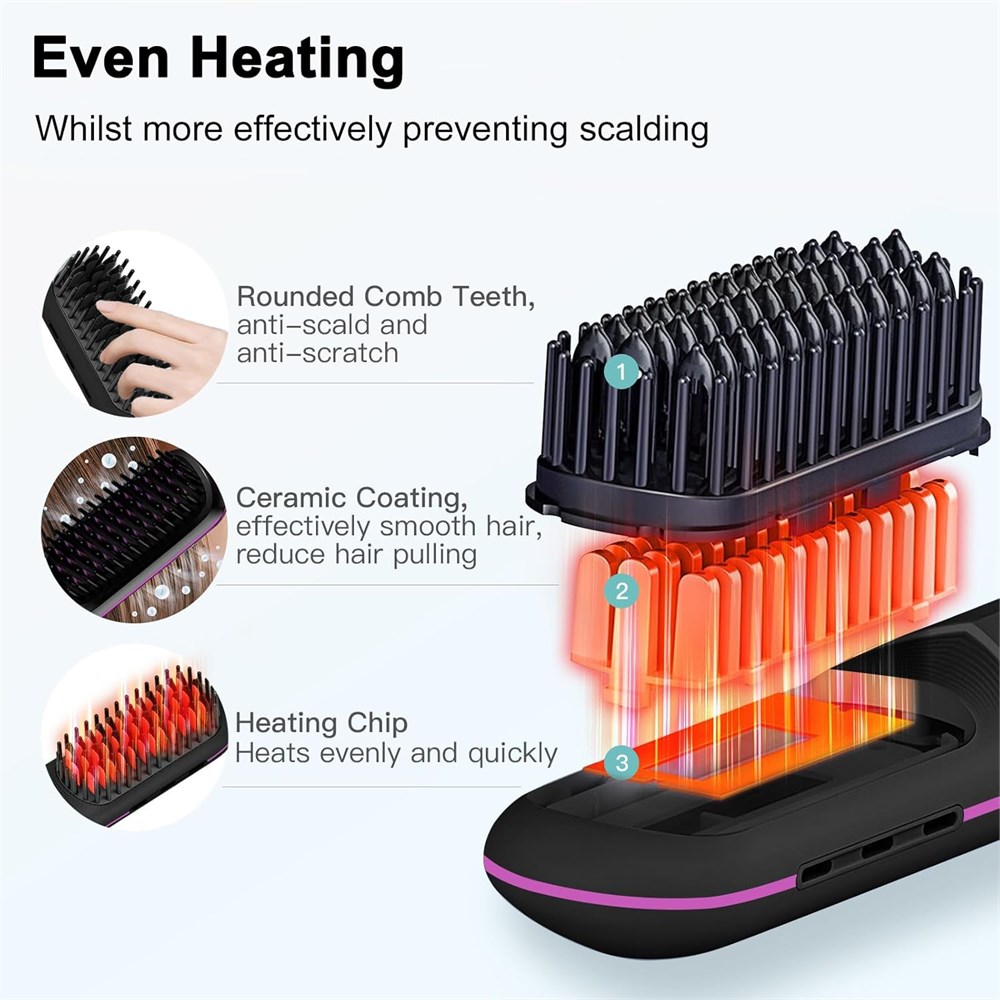 Quick & Efficient Heating: The Ceramic Electronic Hair Straightener adopts MCH ceramic heating technology, fast heating speed, automatic constant temperature, effectively protect hair damage, and make styling more lasting 3-Speed Temperature Settings: Our cordless hair straighteners for women heats up in just 20 seconds with 3 adjustable temperature modes (160 C-180 C-200 C), ensuring fast and smooth hair or beard styling at home or on the go USB Rechargeable & Portable: Equipped with a USB charging port and a 2000mAh battery, this wireless mini hair brush provides up to 30 minutes of continuous use, making it ideal for travel and daily use Hair-Friendly Technology: Our cordless hair straightener brush releases a lot negative ions when heated,reducing hair damage and promoting a smooth finish.The 3D innovative tooth comb double-layer design allows the comb to effortlessly glide on the hair; leaving your hair looking smooth and shiny Suitable for All Hair Types: A portable hair straightener designed for convenience and style,ideal for those who value convenience and style.Whether you have straight; wavy; curly; or coily hair; this brush is designed to meet your needs.