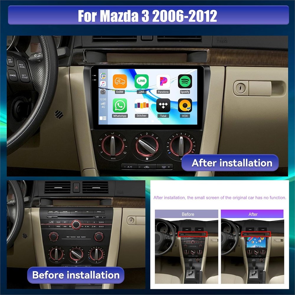 Android 15 Car Stereo Fits for Mazda 3 2006 2007 2008 2009 2010 2011 2012.Android 15 system Quad 4 Core and 4GB RAM + 128GB ROM ensure smooth operation and fast response.9 inch capacitive 2.5D tempered glass touch screen, with high resolution 1280*720 IPS.Clearer picture and richer colors. Built-in Wireless Carplay & Android Auto& Mirror link Bulit in Wireless Carplay Android Auto, support to use smart voice assistant or touch the display, you can make calls, send and receive messages, and enjoy music etc. A smarter, safer and more fun way to use your phone in the car, and keep you stay focused, connected and entertained.car radio support IOS/Android mirror link, mirror your phone's screen on the device's display, You can use your phone's apps, music, videos, etc on the device. GPS Navigation & WiFi The Mazda 3 Car radio receiver with GPS / BDS positioning system, pre-installed with Google Offline Maps. With a WiFi connection, online maps work perfectly, you can also download apps from the play store, such as YouTube, Tiktok, Spotify, and more. Bluetooth 5.0&FM/RDS Radio :The Mazda 3 radio comes with high quality FM/RDS radio, equipped with 30 preset radio stations,Internal equipment high-end radio chip,it have powerful noise reduction and anti-interference ability.Car stereo with bluetooth make sure without distracting your attention from the road when answering calls,Support hands-free calling, listening music and etc. AHD Camera&Steering Wheel Control :The Mazda 3 car radio is equipped with a reversing camera, waterproof design, ultra-wide night vision, and ultra-wide field of vision. When reversing, the camera reversing image will be automatically displayed on the touch screen. The car radio supports the car steering wheel to remote control the radio panel, including switching songs, switching channels, adjusting volume, answering calls, etc., you can easily complete the operation while driving. Split-screen function&EQ Setting : The 9-inch radio touch screen supports split-screen function, which can display two software interfaces at the same time. For example, while you are looking at the GPS navigation map while driving, you can also display the music interface side by side on one screen, so that the two software interfaces can appear at the same time.EQ equalizer with excellent noise reduction, bass enhanced amplification creates an immersive music feast for you. EQ can be adjusted as you like.