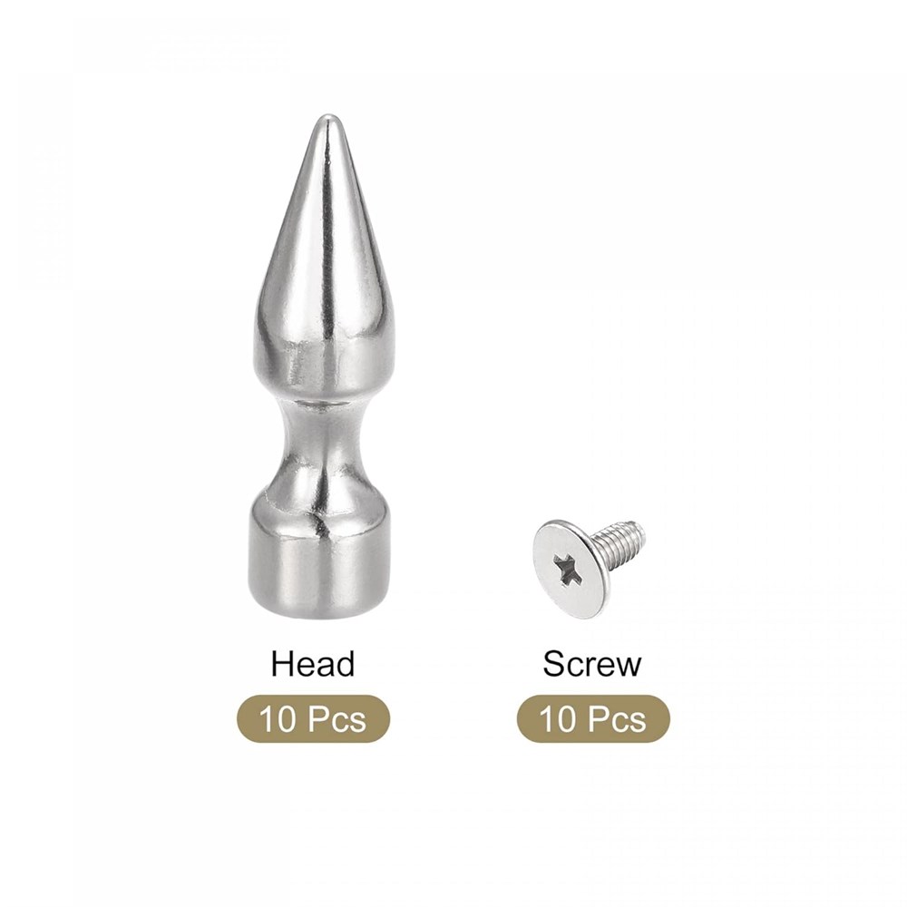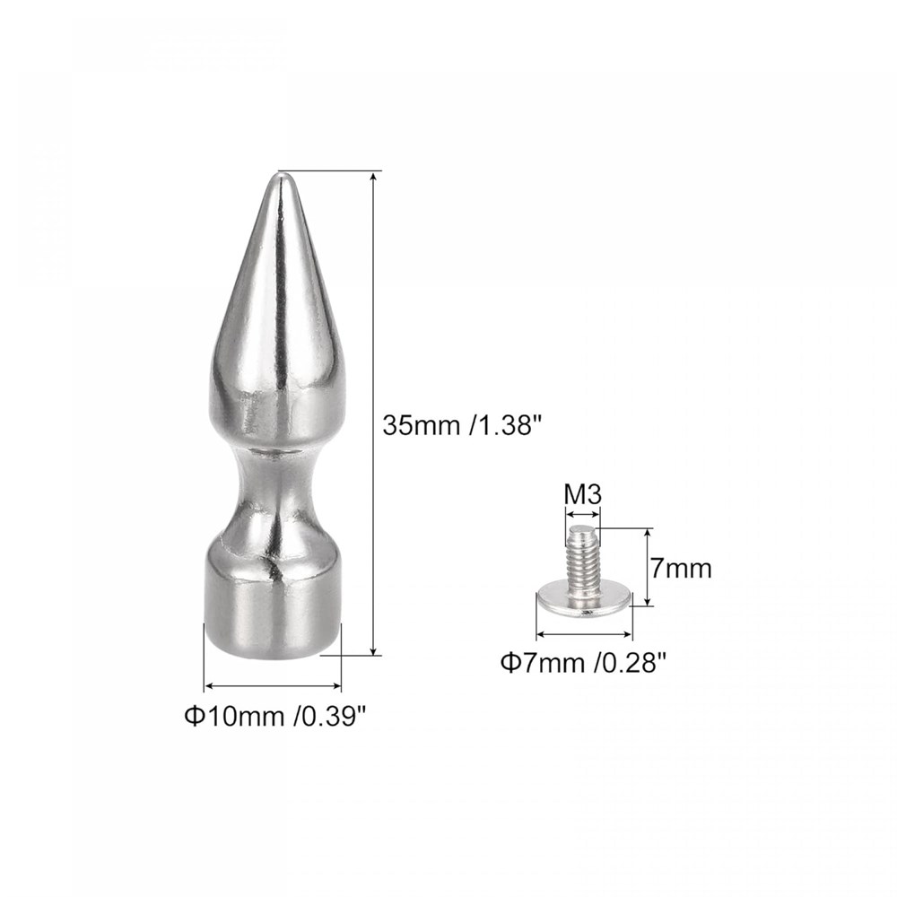 Color: Silver Tone; Rivet Diameter: 10 x 35mm / 0.39" x 1.38"(Base Dia.*H); Screw Thread Size: M3x7mm; Screw Head Dia.: 7mm / 0.28"; Suitable for (Max.): 2mm / 0.08" Thick Package Included: 10 Sets - 10pcs Rivets + 10pcs Screws Material: This spike studs rivet is made of zinc alloy material, electroplate finished, wear-resistant and corrosion-resistant, durable. Application: Screw-back stud rivet is suitable for all kinds of leather goods, such as belts, handbags, shoes, clothes, etc. You can DIY your items at will. Installation: You need to open a hole in advance, first press the base screw into the hole, and then use the rivet to align the thread and tighten it to complete the installation.