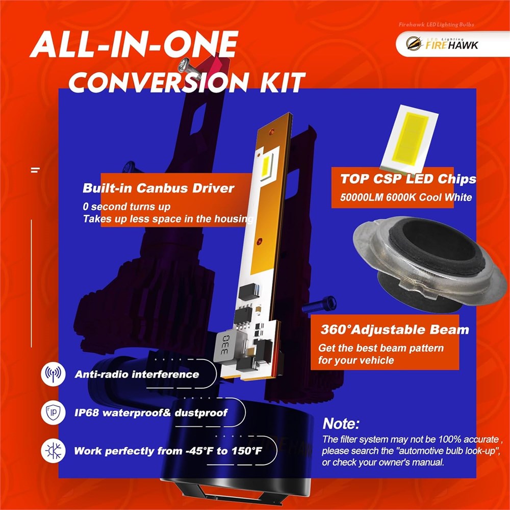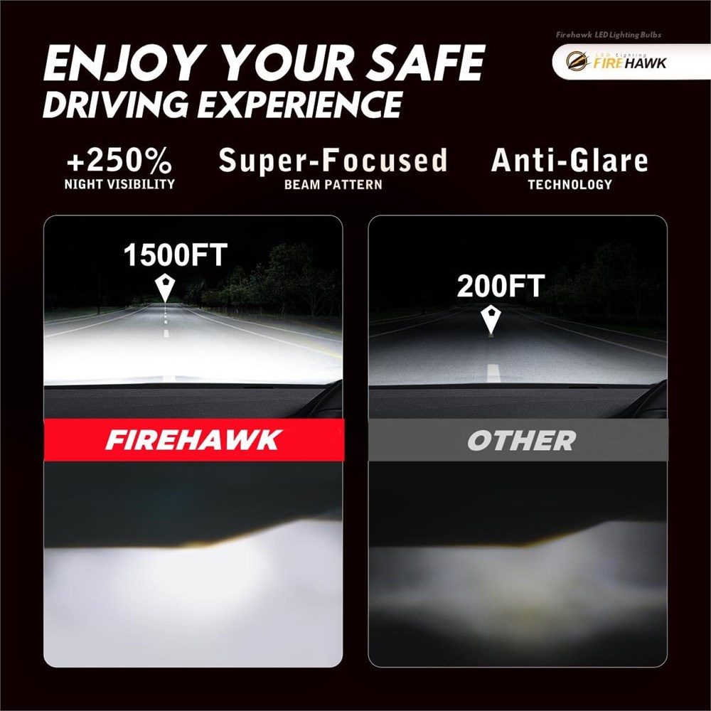 Brightest Bulbs Under $100 Newest Japanese LED chips with 50,000lm per pair, 6000K Xenon White, +700% Brightness, +250% Night Vision. Super-Focused High Low Beam Pattern, no dark spots, no shadows, no blinding oncoming traffic Last Over 50,000 Hours Most advanced cooling system ever: 2mm thickened red copper, 40pcs aviation aluminum heat sinks, 12,000RPM silent turbofan, these improved construction techniques and materials make the Firehawk bulbs last 100 longer than your original halogen 5-Mins Easy Installation 1:1 halogen design, plug and play, no polarity, hassle-free, perfectly fit into your lighting housing True All-in-One Kit Built-in Canbus Driver, 0 second turns up, takes up less space in your housing. 360 Adjustable Beam, get the best beam pattern for your vehicle. IP68 Waterproof, Anti-radio interference, Work perfectly from -45 F to 150 F.