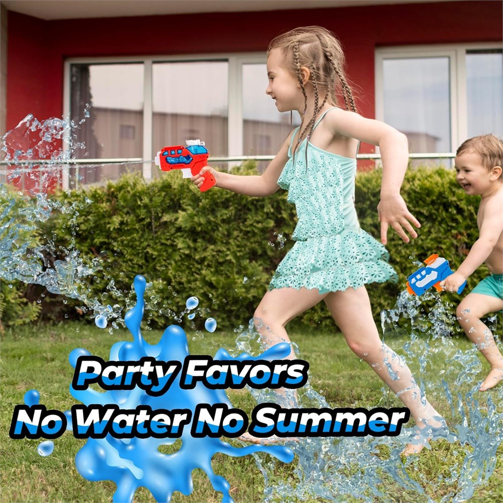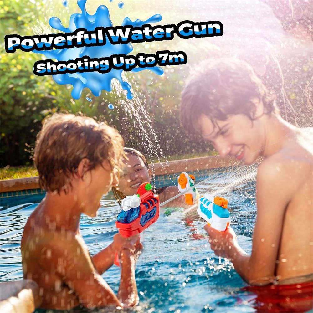 4 Pack Safety Water Gun: Our water gun had passed the safety and durability test, resistance to falling. Meet UK EU US Toy Standard. It s very safety for children. The smooth design is very cool and safety. Their perfect size makes them ideal for kids of all ages and even adults to join in the action. This is an excellent summer gift for children over the age of 3! High Quality Water Squirt Pistols: The product is made of non-toxic high quality material, it s more sturdy than cheaper water gun on the market, not easy to broke and without leaking. Note: The water gun should be fired horizontally or 45 degree to avoid water leakage due to the air pressure principle. Easy to Use and Fill: Our water pistol is easy to play. Just fill the water tank with water and pull the trigger, then kids can enjoy themselves - water battle with 7M Long Range! Comfortable Trigger: The trigger is upgraded design compare with traditional model. Bigger and cooler than tradition water guns, it's very comfortable to hold even if you use it for a long time. Enjoy Summer Water Game: The water guns is great for summer water fights. Suitable for pool parties, beach/backyard games and other outdoor activities. You can also use it to train your dog or cat. Or scare the birds or pets not to destroy your lawn in a gentle way.