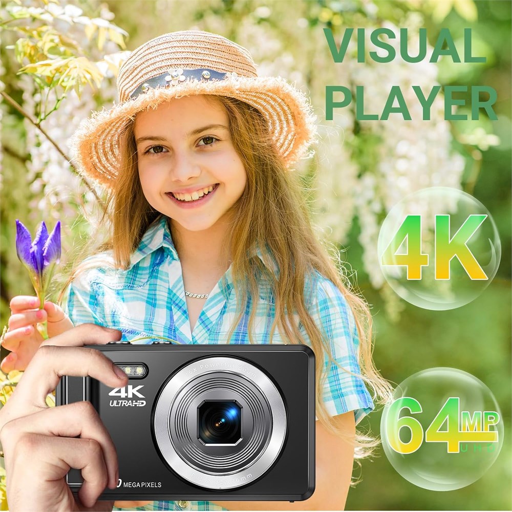 Digital Camera & UHD 4K 64MP Experience the power of 4K ultra-high definition resolution and 64 megapixels with this cutting-edge digital camera. Equipped with the latest CMOS image sensor, The 4k digital camera brings your photos to life with stunning detail. Designed with an intuitive adaptive shooting mode, this easy-to-use camera is perfect for beginners and children alike just press the shutter and capture beautiful moments effortlessly. The compact digital camera is the ideal tool to help young ones explore the beauty of the world around them. Auto Focus with 16x Digital Zoom The point and shoot digital camera features an advanced autofocus system, allowing you to focus effortlessly with a half-press of the shutter button. Achieve sharp, clear images with ease. The 16x digital zoom ensures crystal-clear shots whether you re capturing close-ups or distant landscapes, bringing every moment to life. These features make it a joy to use, letting you capture life s fleeting moments with ease. Kids Digital Camera with a Large Screen More than just a point and shoot camera, this camera also doubles as a webcam for video recording and calls. This small digital camera comes with a built-in flash for low-light environments, as well as fun features like slow motion, continuous shooting, and filters that spark creativity. The 2.8-inch IPS HD display offers sharp, vibrant visuals during both shooting and playback, making your photos and videos come to life with rich detail. Long Battery Life & Ample Storage Equipped with a 1200mAh removable lithium batteries, this digital camera with flash boasts more than twice the battery life of conventional vlogging models. Plus, a high-speed 32GB memory card is included, offering enough space to store over 10,000 photos. Whether you re at home or on the go, our camera is ready to capture your best moments, wherever they happen.