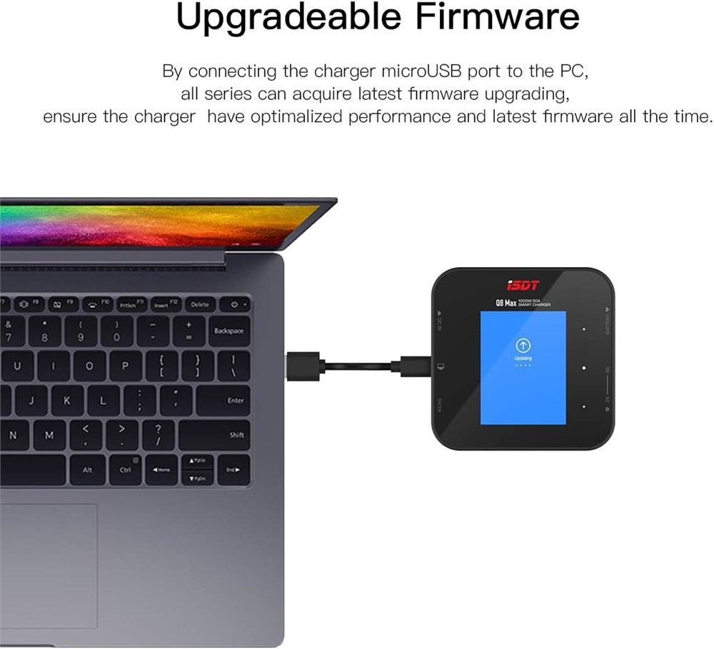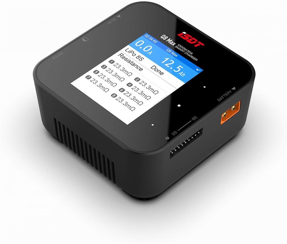 New Generation of Pocket Charger:1000W high power,Max 33A charging current,support 2~8S battery. Lights off in the dark,introducing the dark mode.scOS 2.0 new dark mode feature.Suitable for low light scenario,System will adjust the interface in dark tone,Reduce light damage to user s eyes.While remaining the iconic and comfortable charging display style. 5V/2A USB output. Q8 Max equipped with 5V/2A USB output port, For mobile device charging. IPS Screen:Low power consumption: 2.4 IPS screen Auto-brightness adjustable, 178 visible angle Display clear and distinct Even in varies hard environment or angles As well as in strong sunshine. Advanced crafty cooling air duct Active cross-flow cooling air duct design Initiative ball bearing cooling fan With accurate designed aluminum alloy fins and Hi-Tech silicon heat conduct pad Built up a High efficiency heat dissipation system.