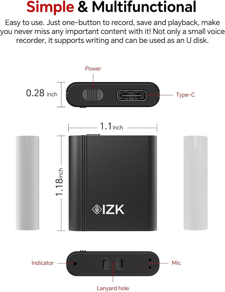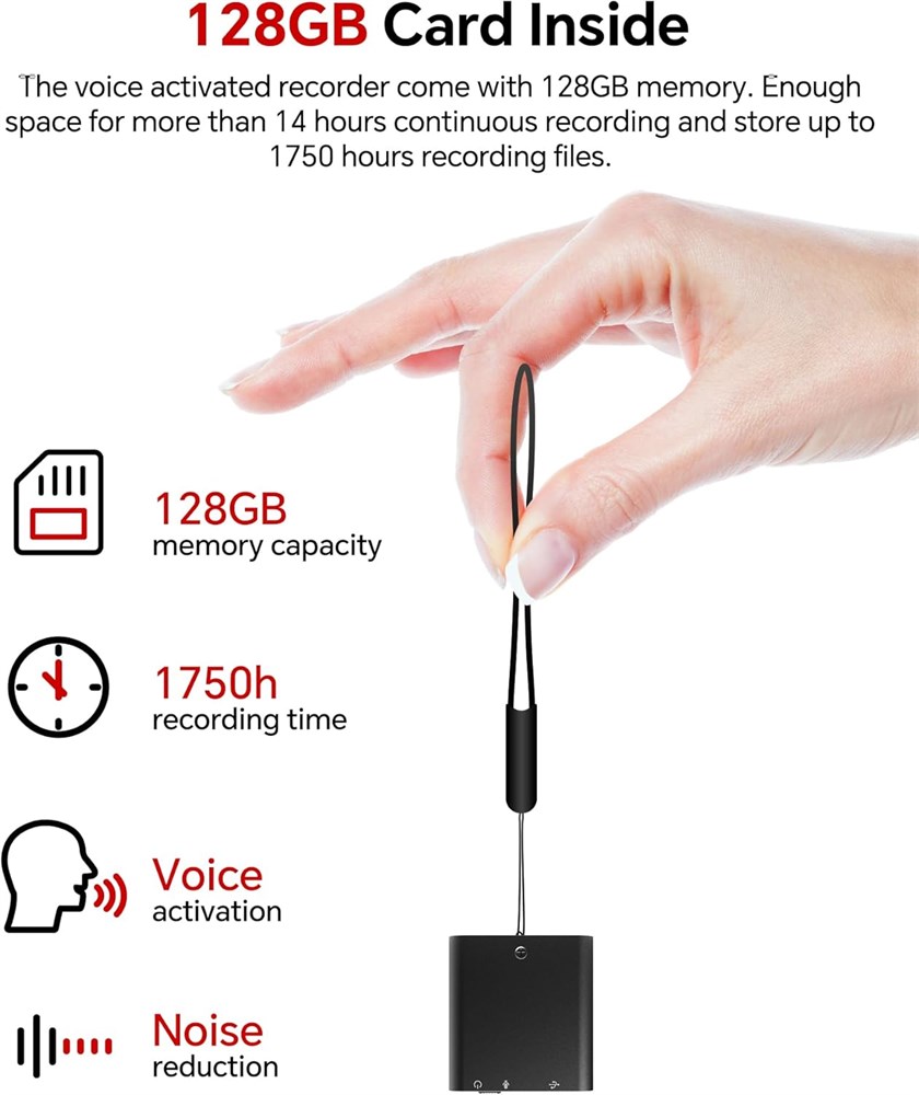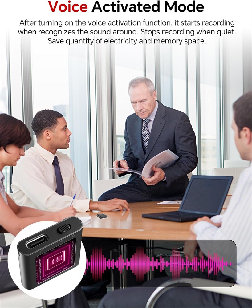 Voice Activated Mode After turning on the voice activation function, it starts recording when recognizes the sound around. Stops recording when quiet. Save quantity of electricity and memory space.has data protection function, automatically save when the battery power is low!!! Automatic Noise Reduction & HD Recording The Voice Recorder devices adopts the latest triple digital intelligent noise reduction technology which can obtain high-quality sound up to 816kbps. Equipped with omnidirectional stereo microphone which can capture farther/lower but clearer sound. The sturdy zinc alloy shell of the recorder ensures durability and it has magnetism. Simple & Multifunctional Easy to use. Just one-button to record, save and playback, make you never miss any important content with it! Not only a small voice recorder, it supports writing and can be used as an U disk. What's In The Box Buy it now to get: 1x 128GB digital voice recorder+ USB cable+ Type-C OTG+ 1x earphone +user manual.