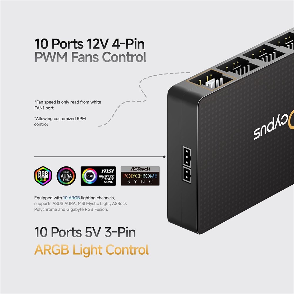 10 port PWM Fan Hub Expansion Each port on this PWM fan hub features PWM function for synchronized fan speed control, effortlessly expanding PC case fans to optimize cooling performance. (PWM fan speed is read only from the white FAN 1 port) 10 port ARGB Controller Expansion Features 10 ARGB output ports to create personalized lighting effects. (Important Compatibility Note: This ARGB hub must be used with a motherboard supporting 5V 3-pin ARGB functionality. It does NOT support 12V 4-pin RGB headers DO NOT insert them!) 19 Keys Remoter The EH10 Pro controller comes with a 19 keys remote control, it can control argb fan light off and on, light speed and brightness, argb light modes and single color lighting. Smart Circuit Safety Protection Each ARGB output port features individual short-circuit and overload protection. If incorrectly connected, only the affected port will be disabled, preventing damage to your entire motherboard device and connected devices. Stable SATA Power Input Even when all 10 ports are fully loaded, the hub maintains stable output. It comes with a SATA power supply interface, directly powered by the power SATA plug, ensuring a reliable and consistent power supply. Magnetic Easy Installation Featuring a magnetic design, easily attached to the interior of your computer case for convenient storage. No complex tools or skills are required. Ultra-Compact Design 97 58.5 15.8mm (L W H), this fan hub features an compact design that can be effortlessly hidden inside your PC case. Important Notes!!! Please distinguish between the 5V 3-pin ARGB connector and the 12V 4-pin PWM connector. Before insertion, ensure the device plug aligns with the corresponding pins on the connector. Incorrect orientation may damage your ARGB device or the hub itself. For any questions, please contact our after sales support team.