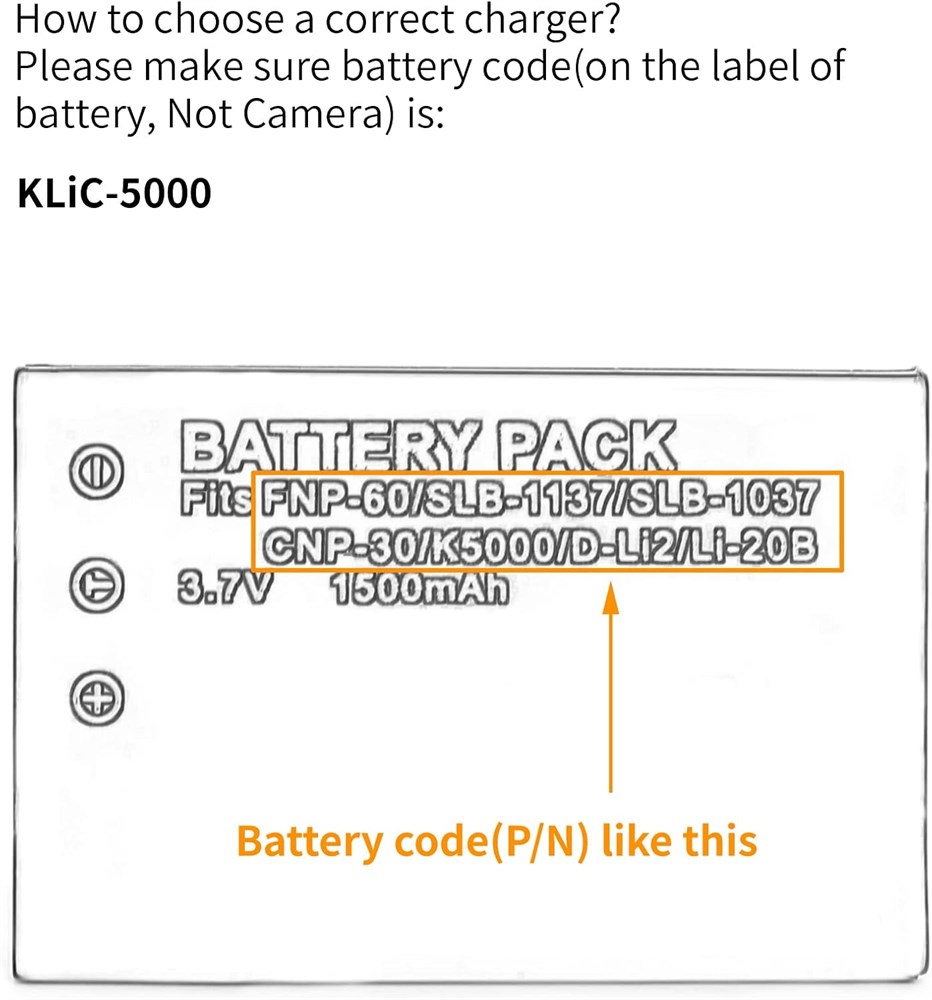 How to choose: Please make sure battery model which printed on the label of your battery(Not camera) is: KLIC-5000 Know Charging Status: LED indicator shows noload (green), charging (red), fully charged (green). Worldwide Use: works under worldwide AC Voltages and Frequencies. Portable: With foldable plug to save space, easy to carry, convenient for travel. Easy to Use: Charge quickly and safely. Keep enough power, never miss any wonderful moment.