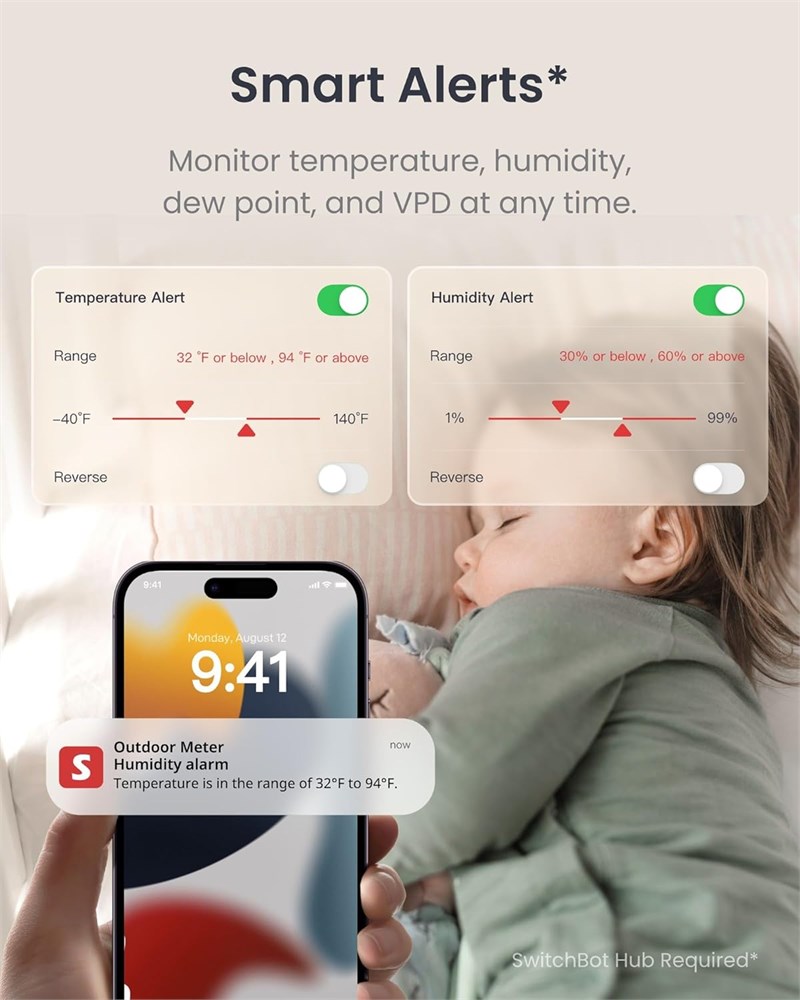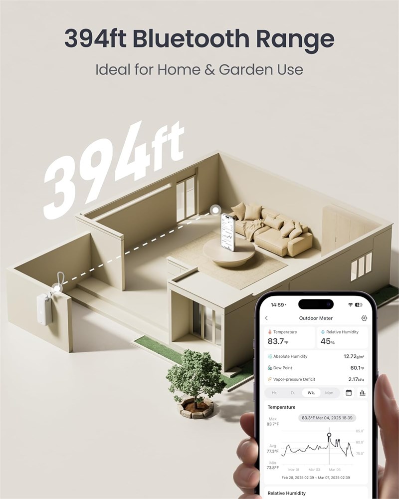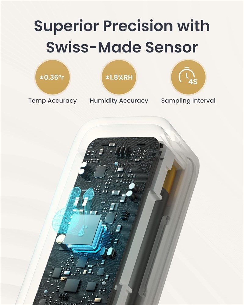 IP65 Dustproof/Waterproof, Suitable for Indoors & Outdoors: Outdoor Thermometer is IP65 dustproof and waterproof and can work safely even on rainy days. They're easy to use, lightweight, and portable. Perfect for kitchens, bathrooms, greenhouses, refrigerators, guitar cases, humidors, attics, basements and crawlspaces. More Sensitive to Temperature & Humidity: With its built-in industrial Swiss Sensirion sensor you can expect more accuracy up to 1.8% RH, 0.36 F, with a faster and more accurate 4sec sampling interval to always monitor the temperature and humidity in your living environment. Supports Data Exporting: 394ft connecting distance (no obstacles) allows you to quickly and clearly view the temperature and humidity yearly, monthly, daily, or by the hour. Enjoy up to 68 days On-board Data Storage and up to 2 years In-App Data Storage(Unlimited cloud storage if SwitchBot Hub is added). Data can be exported as. csv file for more in-depth analysis of your environmental. Supports multiple methods of data calibration. Compact and Durable: indoor outdoor thermometer wireless features a simple and compact design, with a lanyard attached to allow you to hang it to just about anything. With its low power consumption design, you can use it for up to two years, and do not need to replace the removable batteries frequently. Smarter Push Notifications (SwitchBot Hub required): hygrometer now supports Dewpoint, and VPD readings with absolute humidity as well as classic temperature and humidity readings that can be used as Scene conditions. When used with a SwitchBot Hub, should any preset value be exceeded, our app can push a notification alert to allow you to react in real-time to changes in freezer, wine cellar, instrument case, attic, basement, crawlspace, reptile tank, terrarium and more.