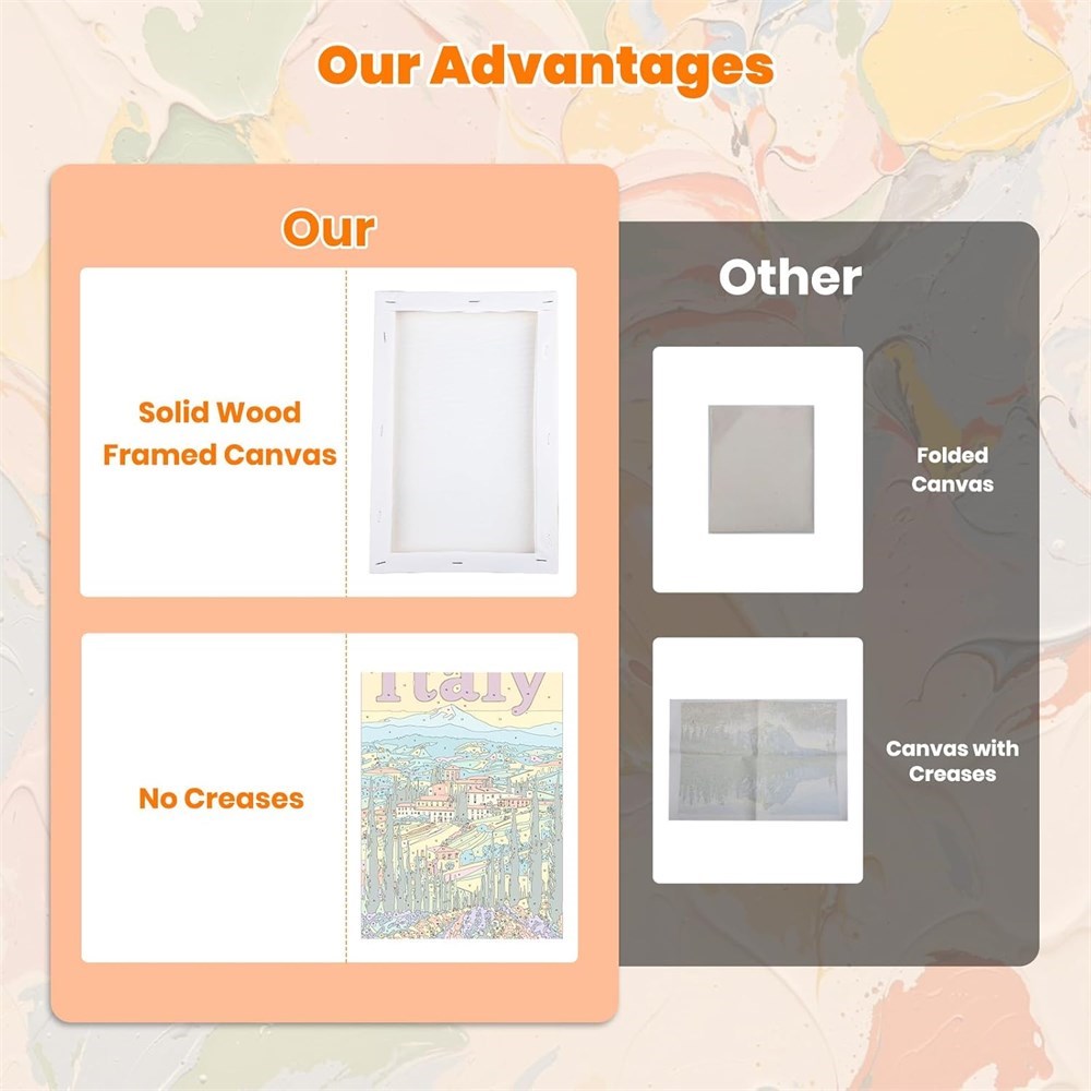 What You Will Get: Paint by numbers for adults with frame canvas, landscapes diy oil painting pattern. 2 pack pre-printed textured art canvas on frame(size 8 x 12 ), 2 set of high-quality acrylic paint, 6 pcs paint by numbers brushes, a manual, 4 hook nails and 12 self adhesive dots. You can hang your masterpiece on the wall for display. Framed Canvas without Creases: Unlike other folded or rolled canvases, the framed paint by numbers kit without creases we offer don't need to be ironed and can be hung directly on the wall as decorative paintings when finished. Our paint by number canvas uses high-definition color canvas and healthy acrylic paints. The number area is easier to distinguish, and paint is easier to adhere to it. Colored canvas can prevent eyestrain and make painting easier. Easy to Paint: This color paint by numbers kits is perfect for teens and adults. No special skills are required, just colour in the corresponding numbers on the canvas and you can create a masterpiece! You will feel a sense of pride and joy when you hang a beautiful piece of artwork that you have created with your own hands. Your Unique Home Decor: Your completed masterpiece is a great way to decorate your home! Whether it is a beginner or a professional, paint by number is a really simple and entertaining hobby. If you want to take up a hobby, you should definitely try diy easy paint by numbers kit, painting kits develop patience and when you are done you will find it worthwhile and an absolutely wonderful hobby! Perfect Gift: Paint by numbers craft kit is the perfect gift to give to friends and loved ones for Birthdays, Christmas, and other holidays. Paint by numbers adult kit is a fun and mesmerizing gift idea for all occasions. Masterpieces done by yourself are unique home decor!