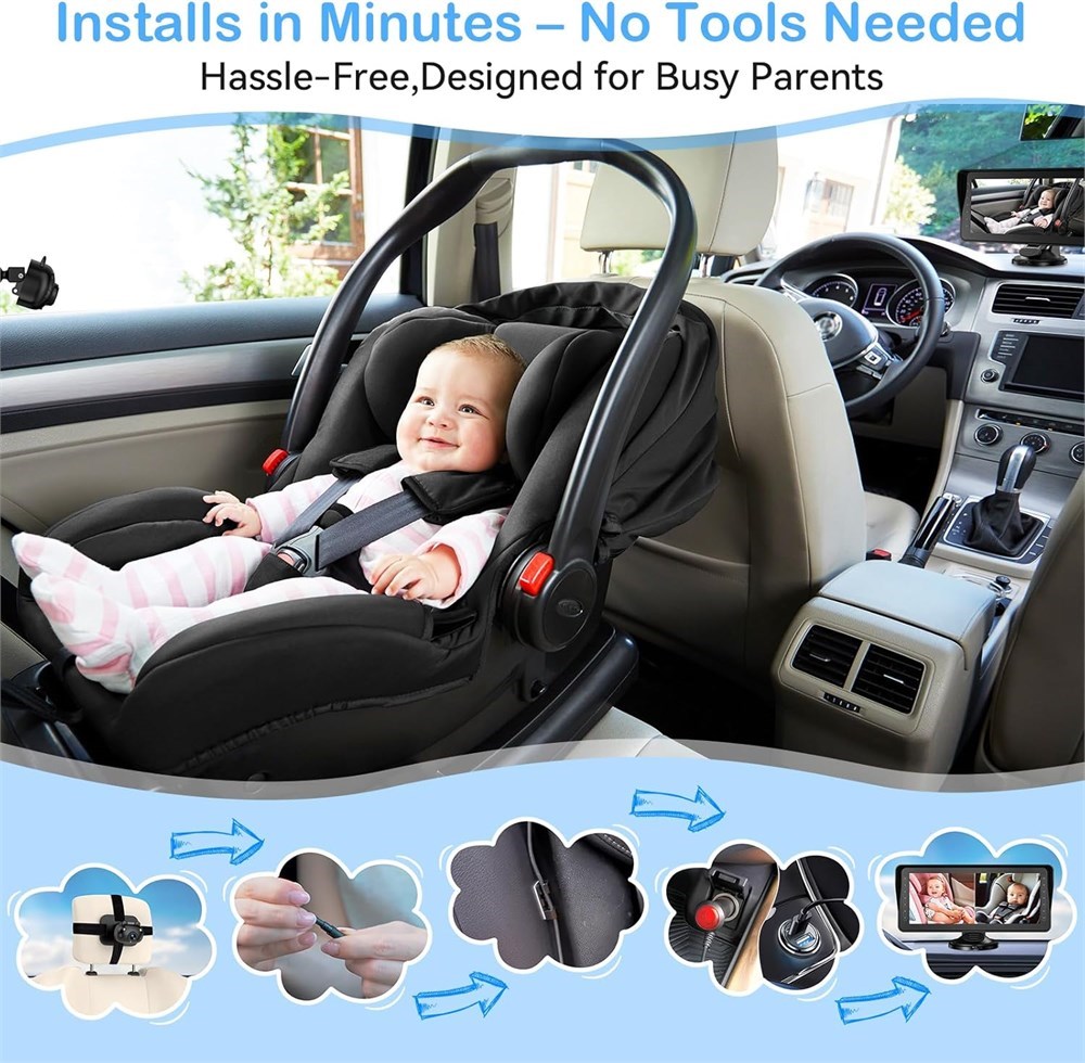 ENHANCED SAFETY CLEAR VIEW FOR BOTH KIDS, DAY OR NIGHT: Monitor your little ones with confidence using Dual HD cameras featuring night vision for clear views in low light. With rotatable cameras, you ll have full coverage and peace of mind, ensuring safety during all drives, day or night EASY INSTALLATION SET UP IN MINUTES, NO TOOLS REQUIRED: Quick, tool-free setup allows you to mount the HD display to your dashboard or rearview mirror and connect the cameras instantly. Perfect for busy parents, the system comes with a simple quick-start guide for a seamless experience 6.9-INCH HD DISPLAY AMBIENT LIGHTING FOR DAY AND NIGHT: Enjoy a 6.9-inch HD display that offers bright, vibrant views with 6 ambient lighting to soothe while driving. The large screen ensures clear monitoring of both kids, making it ideal for daytime and nighttime visibility VERSATILE FOR PARENTS, GRANDPARENTS, AND NANNIES: Designed for all caregivers, this baby car camera system works for parents, grandparents, and nannies. The rotatable cameras provide flexibility, adjusting to various car seat configurations for full visibility FLEXIBLE ROTATABLE CAMERAS FULL VIEW OF BOTH KIDS: The rotatable cameras offer 180-degree rotation, ensuring a perfect angle for both kids. Easily adjust the cameras to eliminate blind spots, providing full coverage of both backseat passengers NIGHT VISION FOR ROUND-THE-CLOCK MONITORING: No need to worry about low-light conditions. Night vision ensures you can monitor your kids even in the dark, providing peace of mind for late-night drives or early morning commutes BUILT TO LAST DURABLE AND RELIABLE FOR DAILY USE: Made with high-quality materials, this camera system is designed for the demands of family life. Vibration-resistant and durable, it performs reliably after countless trips, making it a long-term investment for your car VERSATILE INSTALLATION OPTIONS FITS ANY VEHICLE: This system adapts to any vehicle with multiple mounting options for the HD display and cameras. Mount it on your rearview mirror or dashboard and position the cameras to achieve the best angle for your car type USER-FRIENDLY INTERFACE SIMPLE, NO TECH EXPERT REQUIRED: With an intuitive interface, this system is designed to be easy for anyone to use. One-touch controls and a touch-sensitive display make adjusting camera angles and settings fast and simple PERFECT FOR ROAD TRIPS & DAILY COMMUTES: Whether on a long road trip or during your daily school run, the dual camera system helps keep your kids safe and entertained. Monitor both kids while focusing on the road for a stress-free driving experience.