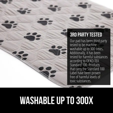 BUILT TOUGH 4 LAYER DESIGN: pet pad features a durable 4 layer design for ultimate protection; the soft quilted top layer is strong enough to resist tearing, 2 leak proof inner layers absorb and disperse moisture, while the slip resistant non adhesive backing features silicone grip dots that help keep it in place 100% WATERPROOF: a pet incontinence pad you can trust; the leak proof pad effectively contains spills and liquid; moisture is quickly absorbed into the pad and evenly dispersed, to keep the areas above and below the pad dry; 34x21 inch pad THOUSANDS OF SLIP RESISTANT DOTS: the slip resistant backing features thousands of non adhesive silicone grip dots, that help to keep the pet incontinence pad in place; no more wet pads spreading messes by slipping and sliding around your home 3rd PARTY TESTED, WASH 300x: save money with our reusable pad that has been tested up to 300 washes; no more expensive and wasteful disposable pads; plus, you can be assured you are buying a great option for your pet s needs; pads have been given the Confidence in Textiles label, and have been tested for harmful substances according to OEKO-TEX Standard 100 free DOG BEDS, CRATES, AND COUCHES: the pad can be used in so many places; the pad creates a perfect spot for pups who sleep in their owner s bed; it can be used as an extra layer of protection in dog beds; pad sizing is consistent with most standard size crates; plus, it will protect your couch from jumping pets; a great option for puppy housebreaking and all furry friends, dogs, and cats alike.