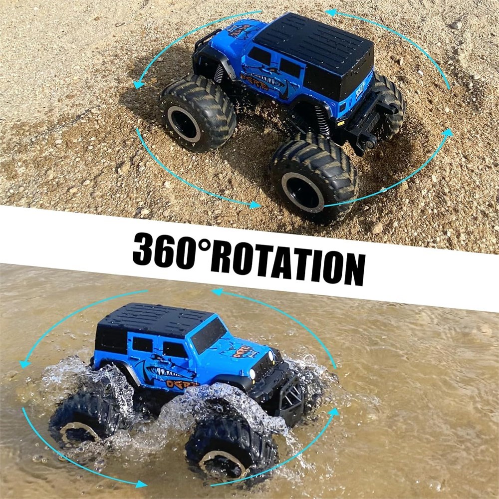 Amphibious Monster RC Car 1:16 4WD RC car can drive on water front and back. It can also flip backwards and forwards and 360 rotation on land, sand and grass, so you can play freely with your family on the river and swimming pool. 55 Mins Play Time Equipped with 2*7.4V 900mAh batteries, you can enjoy about 55 mins of driving depending on the operation (28 minutes per battery). The USB charging cable provides great convenience and safety when charging the RC car. With all-terrain large wheels and with shock absorption, it can protect the remote control car and important accessories. IPX6 Waterproof and Independent Signal without Interference Equipped with 2.4GHz remote control system, the signal is stable and can prevent signal interference when multiple cars are played at the same time. The control distance is about 50 meters on land and 30 meters in water, so your kids and their friends can play together. Gift Idea for 8-14 Years Old Kids The monster truck has 20km/h speed and is suitable for 8 years old boys and bigger kids. Easy to operate, take them anywhere, such as grassland, park, to enjoy good family time.