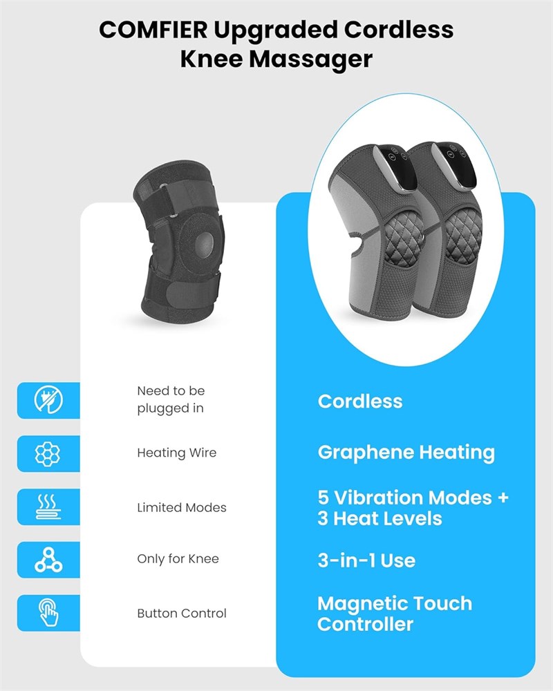 Vibration Massage: COMFIER Knee Massager combines 5 levels of vibration modes and 3 levels of graphene heating function ( 104.0 F - 122.0 F - 140.0 F ).The vibration and heating can be used independently, so you can customize the massage that suits you best. Relax knee through vibration massage and the heating function. Advanced and Portable: COMFIER Heating Pad for Knee uses a magnetic control panel with a 2500mAh battery, meaning it is rechargeable and detachable from the knee pads. You only need to fully charge it with a Type-C charging cable and attach it to the knee sleeve to use it anywhere without being hindered by cables. Whether you are at work, after exercise, or doing housework, you can enjoy a comfortable knee massage. 3-in-1 Design: COMFIER Electric Knee Support Brace adopts a 3-in-1 design, so it can also be used as an elbow massager and a shoulder massager, in addition to massaging arms and calves. The knee massage is equipped with an extended fixed strap to fix the position of the knee pad for a better massage experience. Buying it is equivalent to buying a multi-functional body massager, which not only saves a lot of money, but also brings more enjoyment. Easy to carry: COMFIER Vibration Knee Massager with Heat is made of OK Fabric, which has good stain resistance, wrinkle resistance and breathability. It fits next to the skin and provides support to the knee without making us feel bulky and burdensome, because it only weighs 0.5 pounds (1 PCS). The Heated Knee Massager is foldable and can be easily carried in a bag and taken with you when traveling. Ideal Gifts: COMFIER Knee Brace Wrap features an easy-to-control digital touch-screen control panel with only 3 buttons. It has an intelligent timer of 30 minutes and will automatically shut down when the time is over, so there is no need to worry about safety issues. Therefore it is an ideal gift for women, mother and friends.