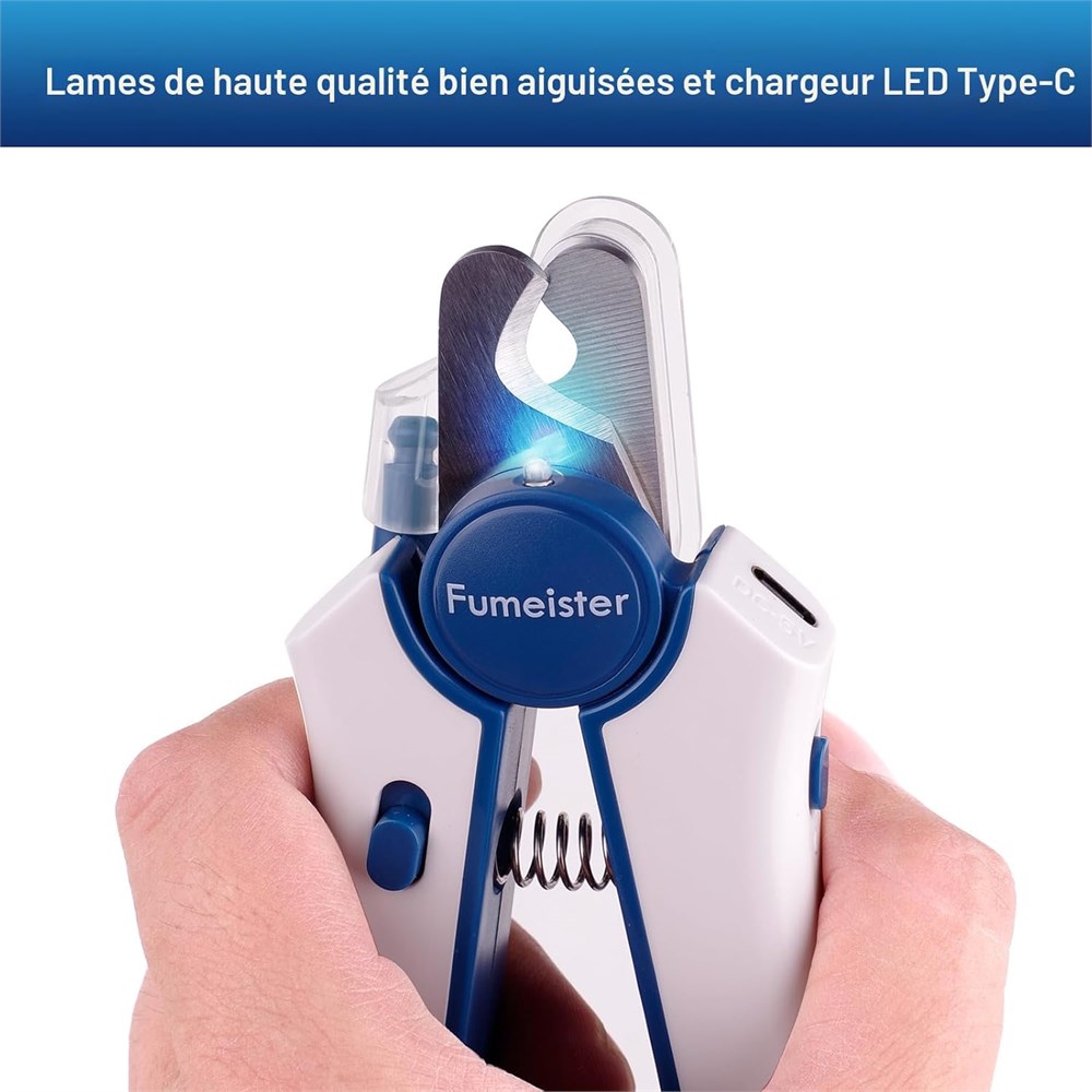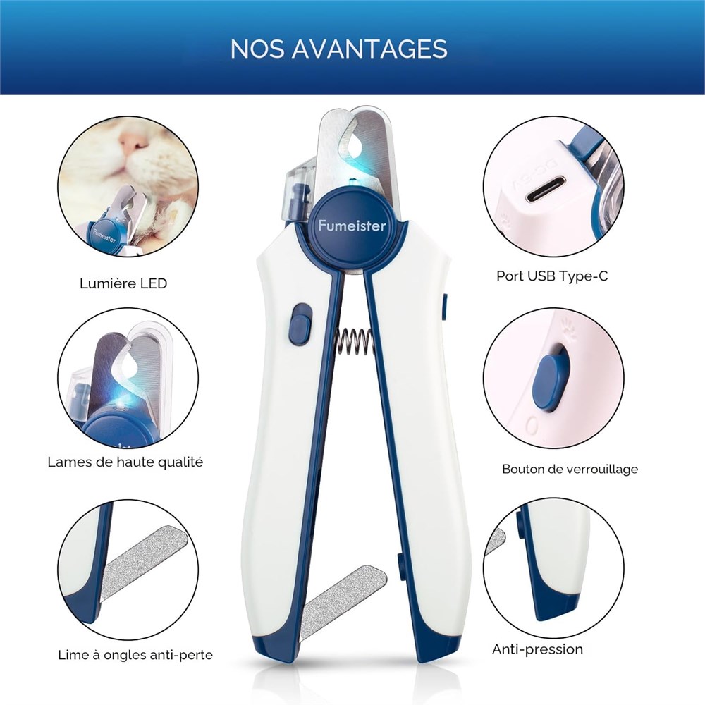 clairage LED et rechargeable de type C : l' clairage LED int gr vous aide couper les ongles en toute s curit et avec clart , tandis que le port de charge pratique de type C garantit que votre coupe-ongles pour animaux est toujours pr t l'emploi Poign e ergonomique antid rapante et anti-compression : confortable tenir avec une poign e anti-compression am liorant la s curit avec une partie saillante qui donne un retour sonore s r pendant la coupe Lime ongles int gr e Facile et pratique : comprend une lime ongles int gr e pratique qui est toujours port e de main, facile utiliser et emp che qu'elle ne se perde Syst me de couverture anti- claboussures amovible : coupe flexible et propre avec un prot ge-ongles anti- claboussures qui recueille les d bris et vous donne une vue plus claire Lames en acier inoxydable tranchantes avec verrou de s curit pour enfants : lames durables et pr cises avec une protection de s curit suppl mentaire pour les animaux de compagnie et la tranquillit d esprit pour vous.