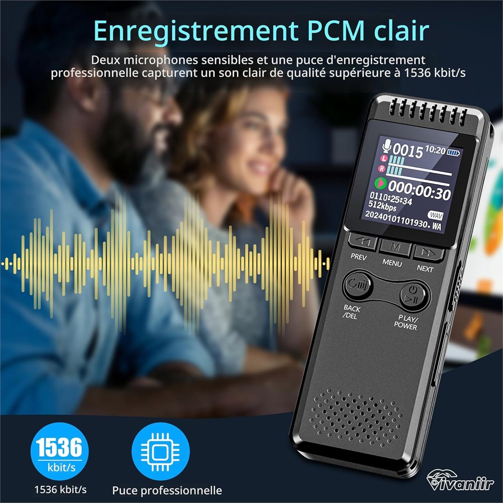 Enregistrement clair double micro et PCM de 1536 Kbps : l'enregistreur vocal num rique Vivaniir est quip de deux microphones sensibles et d'une technologie de r duction du bruit dynamique DSP, prenant en charge l'enregistrement PCM jusqu' 1536 Kbps pour un son cristallin exceptionnel M moire massive de 128 Go et 330 jours de stockage : avec le support d'une m moire interne massive de 128 Go, il peut stocker des dur es d'enregistrement allant jusqu' 8000 heures ou 330 jours 32 kbps, vous permettant d'enregistrer librement sans vous soucier d'une m moire insuffisante 80 heures d'enregistrement ultra long et batterie puissante de 1100 mAh : apr s avoir t compl tement charg via l'interface USB de type C, l'enregistreur vocal longue dur e de vie de la batterie peut maintenir un enregistrement continu jusqu' 80 heures Simple mais puissant : facile comprendre, faites glisser le bouton d'enregistrement vers le haut : commencez enregistrer ; faites glisser vers le bas : enregistrer l'enregistrement. Cet enregistreur audio bo tier m tallique avec lecture propose galement : mot de passe, enregistrement avec minuterie, entr e ligne... Enregistreur activation vocale : activez la fonction AVR activ e par la voix, enregistrez uniquement lorsque vous parlez, r duisez le silence et les clips chuchot s, conomisez de la m moire et de l' nergie. Enregistrez facilement vos r unions, entretiens, discours, cours, conf rences Lecture vitesse variable et r p tition A-B : les apprenants en langue peuvent r gler la vitesse de lecture de l'enregistrement pour couter la prononciation et l'intonation de chaque mot. La fonction "R p tition A-B" permet d' couter de mani re r p t e des phrases ou paragraphes sp cifiques, facilitant une meilleure compr hension et l'apprentissage des langues trang res Garantie Vivaniir 2 ans et liste d'emballage : les avantages du client passent avant tout Contenu de l'emballage : 1 enregistreur vocal de 128 Go, 1 c ble USB-C, 1 c ble de transcription de 3,5 mm, 1 manuel, emball de mani re s curis e dans un film.