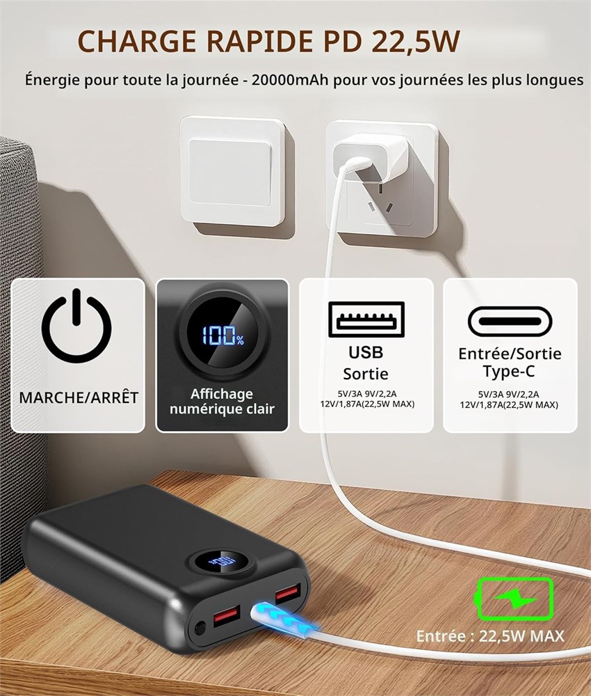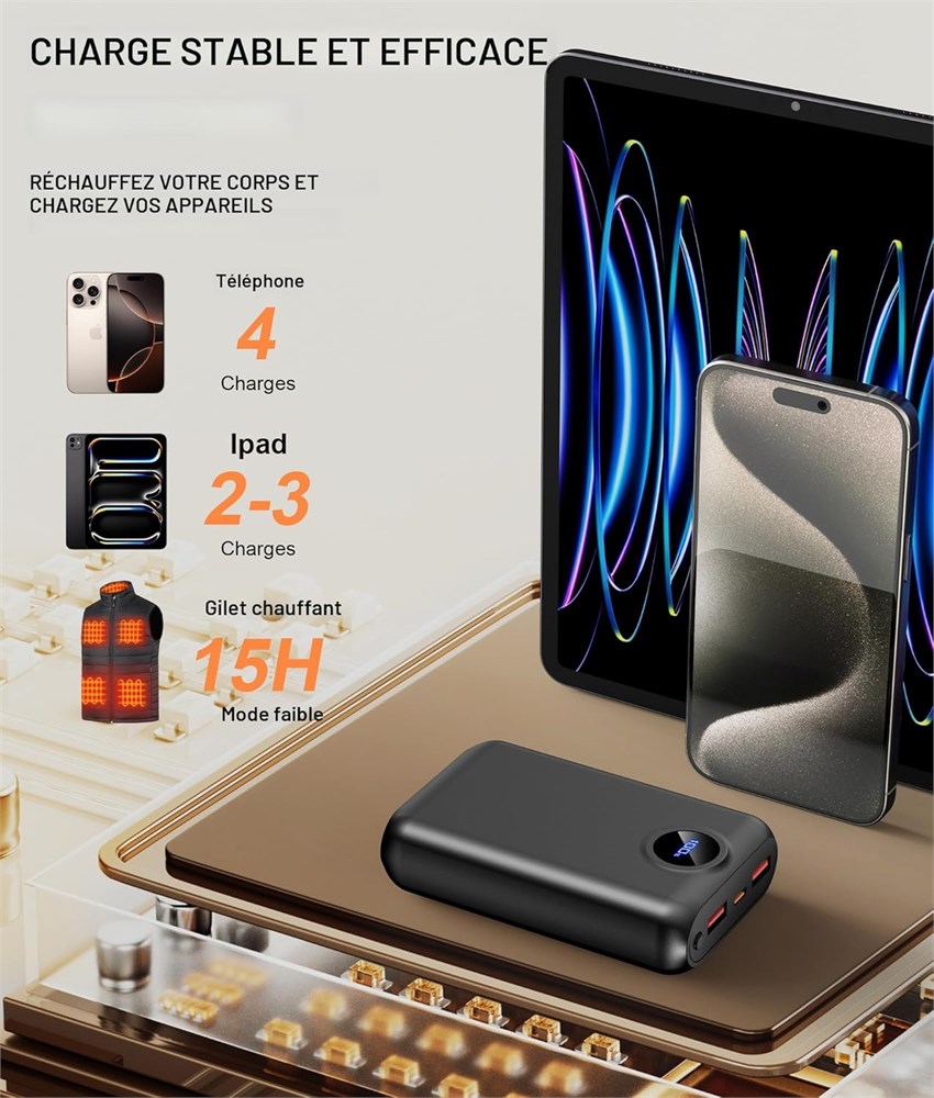 Con u pour les gilets chauffants USB 5 V : Directement compatible avec les gilets chauffants USB 5 V (comme Soleilwear), les vestes (comme TIDEWE), les pantalons, les hoodies et les chaises de camping. Profitez d'une chaleur prolong e pendant 4 15 heures sur une seule charge. Dispose d'une puce sur mesure pour une sortie continue et stable qui vous garde au chaud en toute s curit . REMARQUE : K110 Pas de port CC, Ne convient pas pour les v tements chauffants CC 7,4 V ou CC 12 V Entr e et sortie ultra-rapides de 22,5 W : offre une exp rience de charge de haut niveau dans les deux sens. Recharge la batterie de 20 000 mAh en seulement environ 6 heures, soit 80 % plus rapide que les chargeurs lents 5 V/2 A. Passez moins de temps charger votre quipement et plus de temps l'utiliser Design l ger et portable : Le HIMONI K110 est sp cialement con u pour les gilets chauffants, ne pesant que 278 grammes. Il offre une capacit 84 % sup rieure celle des autres mod les similaires sur le march , tout en tant 20 % plus l ger et 35 % plus petit en volume, quilibrant parfaitement une autonomie de longue dur e avec la portabilit S curit fiable garantie : le produit a pass plusieurs certifications officielles, notamment UL, FCC, RoHS et CE, assurant s curit et conformit . Il dispose de fonctions int gr es de protection contre les surcharges et les surcharges pour pr venir efficacement les risques de s curit pendant la charge. Par rapport aux batteries ordinaires, il offre une plus longue dur e de vie et une performance de s curit sup rieure, offrant une plus grande tranquillit d'esprit lors de l'utilisation Affichage LED de pr cision et ce que vous obtiendrez : L affichage num rique LED pr cis montre votre pourcentage exact de batterie restante de 0 100 %, vous permettant de planifier votre journ e en toute confiance. Tout ce dont vous avez besoin est inclus : Cet ensemble complet est livr avec le chargeur portable K110 de 20000 mAh, un c ble de charge USB-C et un manuel d utilisation, pr t tre utilis d s la sortie de la bo te.