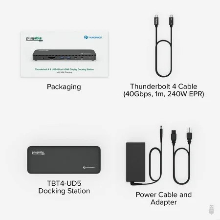 Plugable TBT4-UD5 USB Type-C Dual Display Laptop Docking Stations Dual 4K 60Hz HDMI output for stunning visuals Thunderbolt 4 upstream and downstream ports for high-speed data transfer 100W Power Delivery for efficient charging USB 3.0 ports for connecting peripherals SD and Micro SD card reader for easy file transfer.
