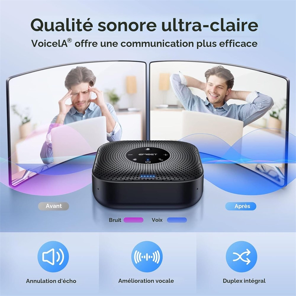 Captation vocale am lior e 360 avec 4 micros IA Le haut-parleur Bluetooth EMEET OfficeCore M0 Plus dispose d'un r seau de quatre micros, ce qui am liore la captation vocale depuis n'importe quelle direction. Aliment par l'algorithme VoiceIA d'EMEET mis niveau en 2023, le micro peut filtrer les bruits de fond et liminer les chos du haut-parleur. Qualit audio cristalline Le haut-parleur de conf rence Bluetooth de haute qualit de 3W peut diffuser le son uniform ment dans toute la pi ce, garantissant qu'aucun d tail n'est manqu . Avec la prise en charge audio duplex complet, notre haut-parleur de conf rence produit des sons naturels et riches, de sorte que vous avez l'impression de parler d'autres en personne. Extensible pour les grandes r unions La salle est trop grande ? En reliant 2 haut-parleurs Bluetooth EMEET avec la Daisy Chain, vous obtiendrez 2 microphones et haut-parleurs professionnels fonctionnant de mani re transparente pour tendre l espace de conf rence, prenant efficacement en charge jusqu 16 participants. Cette fonctionnalit prend en charge plusieurs mod les de produits EMEET tels que Meeting Capsule, M3 ou M0 Plus, ce qui en fait une solution flexible pour configurer votre salle de conf rence. Facile installer et utiliser Le haut-parleur et le microphone de conf rence EMEET M0 Plus offrent deux fa ons de se connecter : USB-C pour une connexion filaire super stable, et Bluetooth 5.0. Aucun pilote ou logiciel suppl mentaire n'est n cessaire, il suffit de le brancher et de l'utiliser. Le haut-parleur Bluetooth est compatible avec la plupart des plateformes de conf rence, telles que Zoom, Microsoft Teams, Skype for Business, Slack, Webex, et plus encore, afin que vous puissiez commencer votre r union instantan ment. Longue dur e de vie de la batterie pour une performance optimale quip d'une batterie de grande capacit , le haut-parleur de conf rence Bluetooth M0 Plus avec microphone supporte les appels de longue dur e de plus de 10 heures de temps de conversation sur une seule charge, ce qui le rend parfait pour les r unions d'une journ e enti re. Le haut-parleur de conf rence Bluetooth M0 Plus est optimal pour une utilisation dans la salle de r union, le bureau domicile ou lors de voyages d'affaires, vous assurant toujours une exp rience de r union professionnelle.