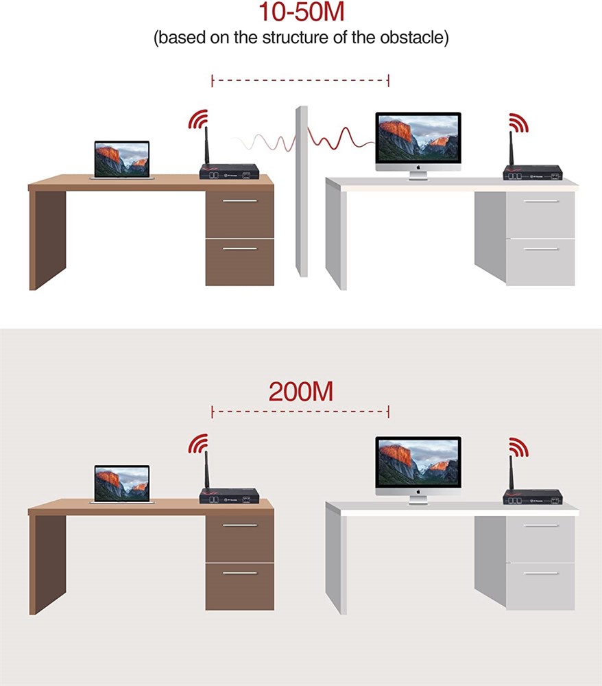 1080P Wireless Transmission Wireless HDMI Transmitter and Receiver Input/output resolution supports up to 1080p@60Hz, the image is clear and stable very smooth for sports programs, colorful and high sound quality without noise. : suppot PCM stereo only. Up to 200m Transmission Range Extends 1080P full HD HDMI signal wirelessly up to 200m/656ft in an open field without interference. Transmits 10m-50m (32ft-165ft) through an interior drywall or other obstructions, stable and reliable. Wired Mode Option The RX and TX can connected with ethernet cable, extends 1080P full HD HDMI signal up to 120m/394ft. Auto Optimal Channel Selection With auto matching feature, the HDW100 will automatically search for the best channel and automatically jump to a new channel when the current wireless network signal is poor. Less Latency, Local Loop-out Delay time between wireless transmitter and receiver is less than 100ms(compared to market standard of 300ms). A HDMI loop-out for local display, allows you to enjoy same show in different rooms. Excellent for church and home entertaining. Plug & Play Extremely easy to install, no software required, no need to setup anything, TX and RX connect automatically when they are in range, truly plug and play. IR Return The extender will send back the IR signal so you can control source device at receiver s end.