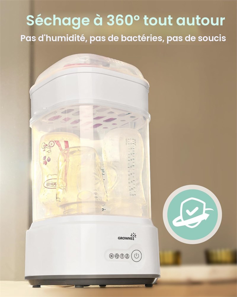 Efficacit : les biberons/accessoires pour b b sont entour s de vapeur haute temp rature, qui patrouille dans chaque coin, ne laissant aucune bact rie vivante St rilisez rapidement et efficacement en 8 minutes, gagnez du temps et de l' nergie sur le processus de st rilisation/s chage. S che-linge intelligent : s chez efficacement vos bouteilles avec de l'air chaud et filtr , utilisez l'option automatique (st rilisateur + s che-linge) ou utilisez-les s par ment, il n'y a pas besoin de vous asseoir l et de s cher les bouteilles et d'avoir l'impression qu'elles ne sont plus propres, vous avez assez d'autres choses faire alors laissez cette machine vous aider Un sanctuaire st rile, pr t jour et nuit : apr s st rilisation, le filtre int gr emp che la pollution secondaire par l'exposition une nouvelle contamination dans l'air, assurant que chaque bouteille l'int rieur reste dans un tat impeccable. Qu'il s'agisse de la prochaine alimentation, d'un repas de r ve de minuit ou d'une surprise t t le matin, votre bouteille est garantie d' tre s re, s che et pr te. Il est exempt de rin age de derni re minute et de doutes de s curit . Facile nettoyer : essuyez la plaque chauffante apr s refroidissement, nettoyez-la en quelques secondes, et il est fortement recommand d'utiliser de l'eau distill e pour viter le calcaire et de la nettoyer avec une solution de vinaigre et d'eau une fois par semaine pour la garder propre et fonctionner correctement. S'adapte tous : couvercle pour les petites pi ces et grand tui pour bouteilles, les deux tuis peuvent tre utilis s ensemble ou ind pendamment car ils s'adaptent la base et le couvercle, faciles nettoyer, des biberons aux sucettes, m me les petits jouets en une seule tape facile L ger et compact : vous pouvez facilement le ranger dans le placard gr ce son design pliable, et sa taille raisonnable permet de st riliser plusieurs articles sans prendre trop de place sur le comptoir de la cuisine. Un produit parfait pour les voyages et les sorties. (Nous avons optimis et mis jour les fonctionnalit s du produit, vous pouvez recevoir la nouvelle version)