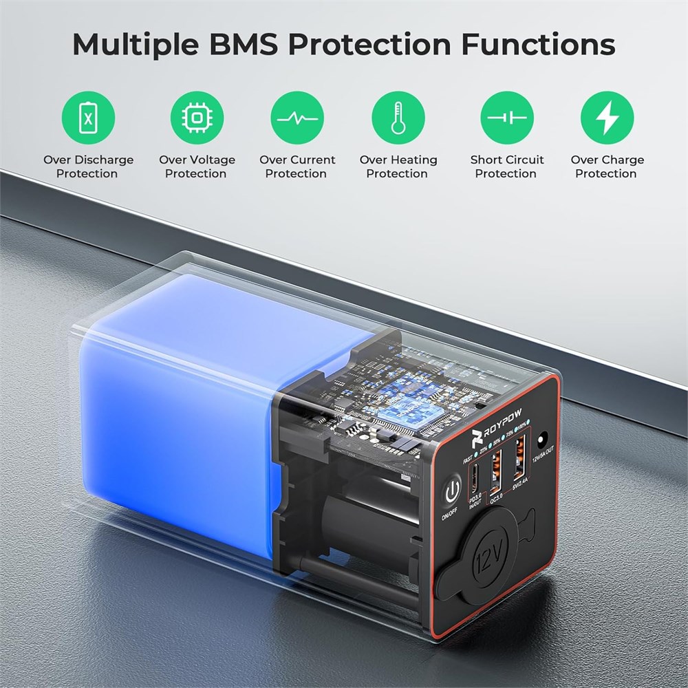 86.58Wh Huge Capacity & Wide Compatibility : This power bank has a total capacity of 86.58Wh, 3.7V @23400mAh or 11.1V @7800mAh super large capacity, which has enough power to keep devices running for days. Weighting 630g and sizing 6.25*6.25*13cm, it is easy to carry and portable to plane or outdoor activities. Featured with 30W USB C PD output, 18W USB A QC 3.0 output, 12W USB-A output, 12V DC output, and 12V cigarette light outlet, this portable power bank can meet the charging needs of different scenarios, such as iPhone, iPad Pro, MacBook, etc. Multiple Protection Functions : RoyPow power bank has a built-in dedicated lithium battery protection chip circuit, and all output ports are equipped with overload protection and short-circuit protection functions. It also has over discharge protection, over voltage protection, over current protection, over heating protection, over charge protection, greatly improves safety. PD 30W Total Output & Input : RoyPow PD power bank is equipped with PD 30W output port, you can charge your MacBook air to 50% in 1 hour by 30W PD output, for iPhone 11 Pro up to 80% in 1 hour, and PD 30W input also allows this power bank to be fully recharged within 3 hours with 30W PD charger. Fast charging speed saves your valued time. 120W Cigarette Lighter Socket & 12V DC Output : Features a unique 120W cigarette lighter socket design and 12V DC output design. 12V/10A car cigarette lighter outlet charges every device which is under 120W (12V 10A), perfect for Car refrigerator, Air compressor, vacuum cleaner. 12V/5A DC output charges your CCTV Camera, router, 12V speaker, christmas lights and so on. NOT FOR 12V air pump!!! Notes : The voltage of the DC port and cigarette lighter fluctuates due to different battery levels, with a normal voltage range of 8.1V -12.6V. When the battery is fully charged, the voltage is12.3V-12.6V. When the battery level is low, the voltage fluctuates with the actual battery level. 5 Powerful Output Ports : (1) 30W USB C PD output; (2) 18W USB A QC 3.0 output; (3) 12W USB-A output; (4)12V DC output; (5)12V/10A cigarette lighter outlet. Multifunctional portable charger, it is perfect to fit on your desk and easy to slide into your bag. It is a powerful battery backup that is lightweight to carry during working, watching, or traveling. Note : Without charging, Qc port will close after the power button turns on for 10 secs. Press button to turn on QC port, it can power again. Package Included : You will get a package including 1 x RoyPow portable power bank, 1 x 3 in 1 cable, 1 x DC cable, 1 x USB A to USB C Cable, 1 x USB C to USB C Cable, 1 x portable bag, 1 x user manual.