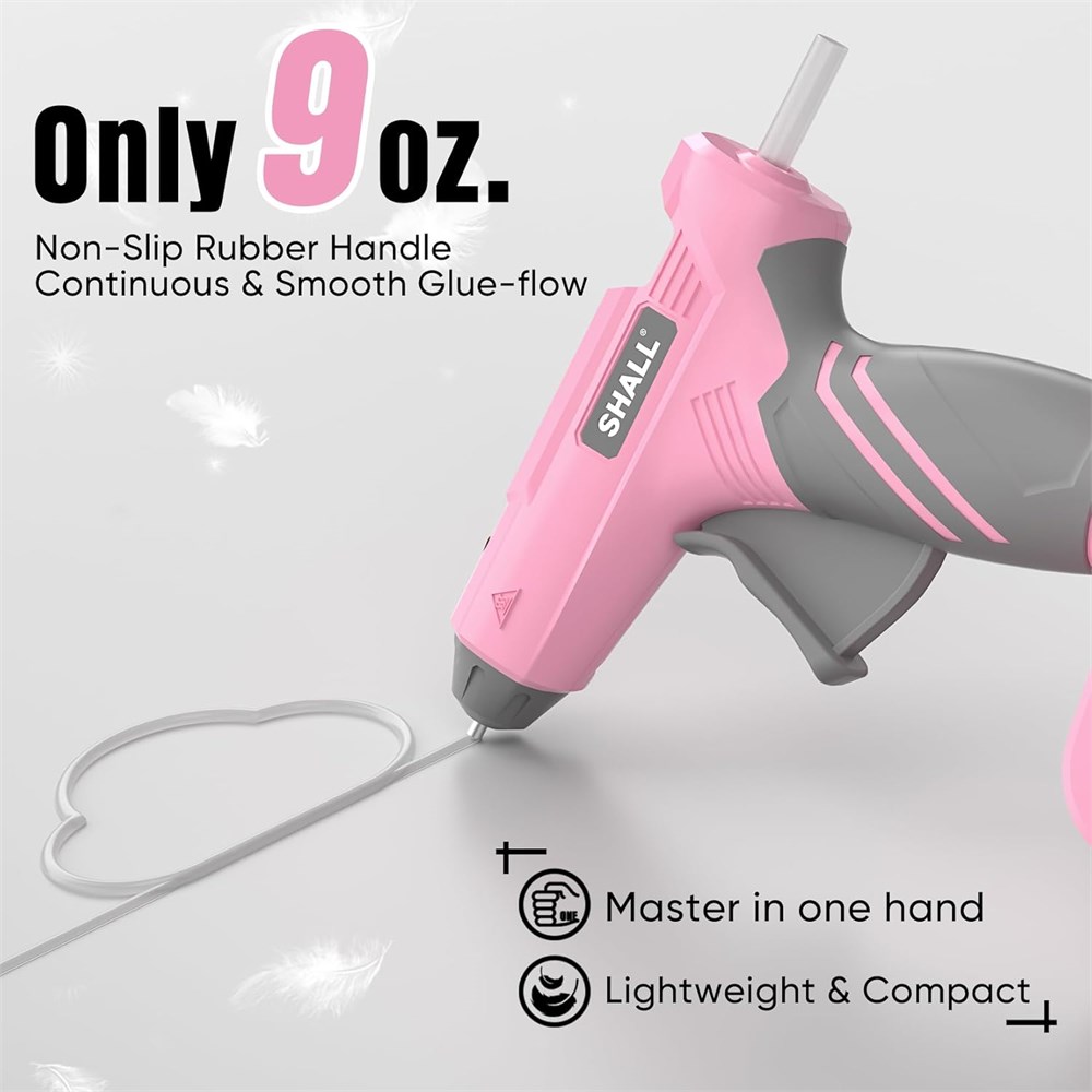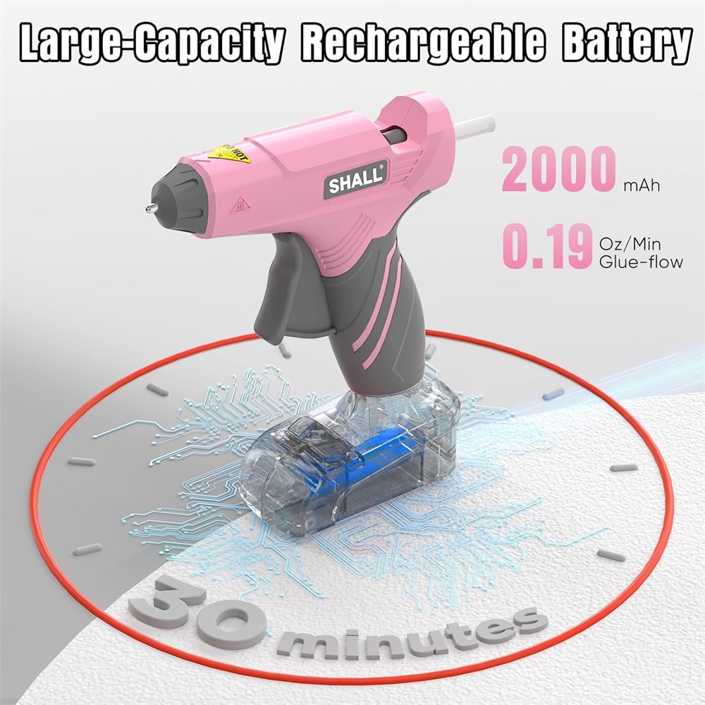 15 Seconds Fast Preheating : Equipped with an upgraded heating system, the cordless hot glue gun features rapid 15 s warm-up time heating up to 338 , which greatly shortened waiting time and improve work efficiency; Red light indicates Heating while blue light indicates Ready To Use Intelligent Power-Off Protection : If it has been inactive for more than 5 minutes, the built-in smart sensor will be triggered to automatically shut down the cordless glue gun to ensure safety and save energy Fast Charge & Long-lasting Battery : Equipped with a large-capacity 2000 mAh rechargeable lithium battery that allows 30 mins continuous work; The hot glue gun kit also comes with a USB-C fast charger that only takes 70 mins to fully charge and can be conveniently connected to laptop, power bank, car charger, computer and more; Red light indicates Low Battery or Charging while the blue light indicates Fully Charged Drip-Free Nozzle & Anti-scald body : The copper nozzle is designed to avoid dripping or leaking and ensure smooth and fast glue flow rate up to 0.19 oz/min; The outer shell is made of heat-resistant materials to prevent from being scalded 12Pcs Long Glue Sticks : Wireless glue gun comes with 12 pcs 6" x 0.27" long mini hot glue sticks that are strong adhesive, clear Stable Stand-up Base : With the stable stand base, SHALL battery glue gun can stand upright without additional support, which is more convenient and safer to use and charge than others Lightweight & Cordless Design : The cordless and 9 oz. lightweight compact design makes craft glue gun portable and user-friendly, providing ultimate freedom for art making Non-slip Rubber Handle : The handle is made of soft textured rubber to provide non-slip and comfortable grip Wide Application : The hot melt glue gun and sticks set is perfect for crafts, DIY, arts, home decoration, etc., and it s also a creative gift for someone who loves DIY on Valentine's Day, Christmas, Halloween, Easter and Anniversaries NOTE : Please fully charge the cordless glue gun before using and do not use it when charging.