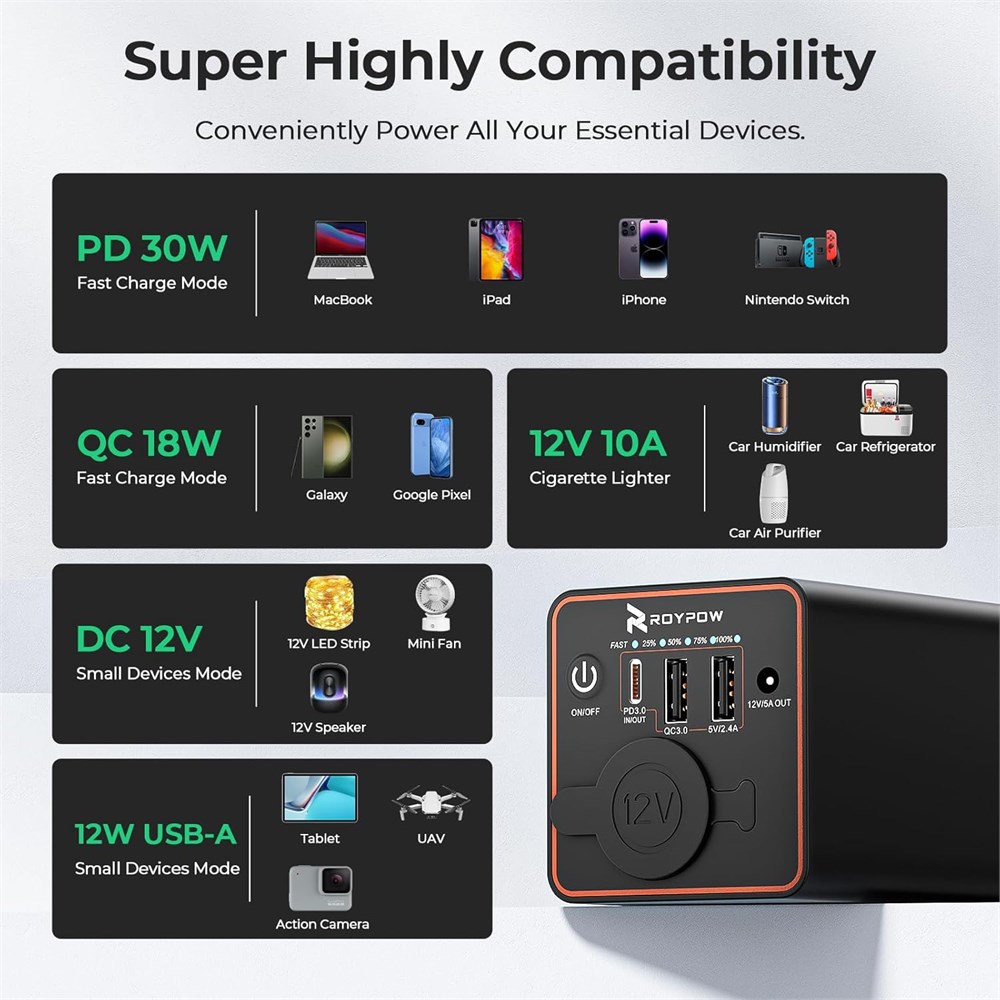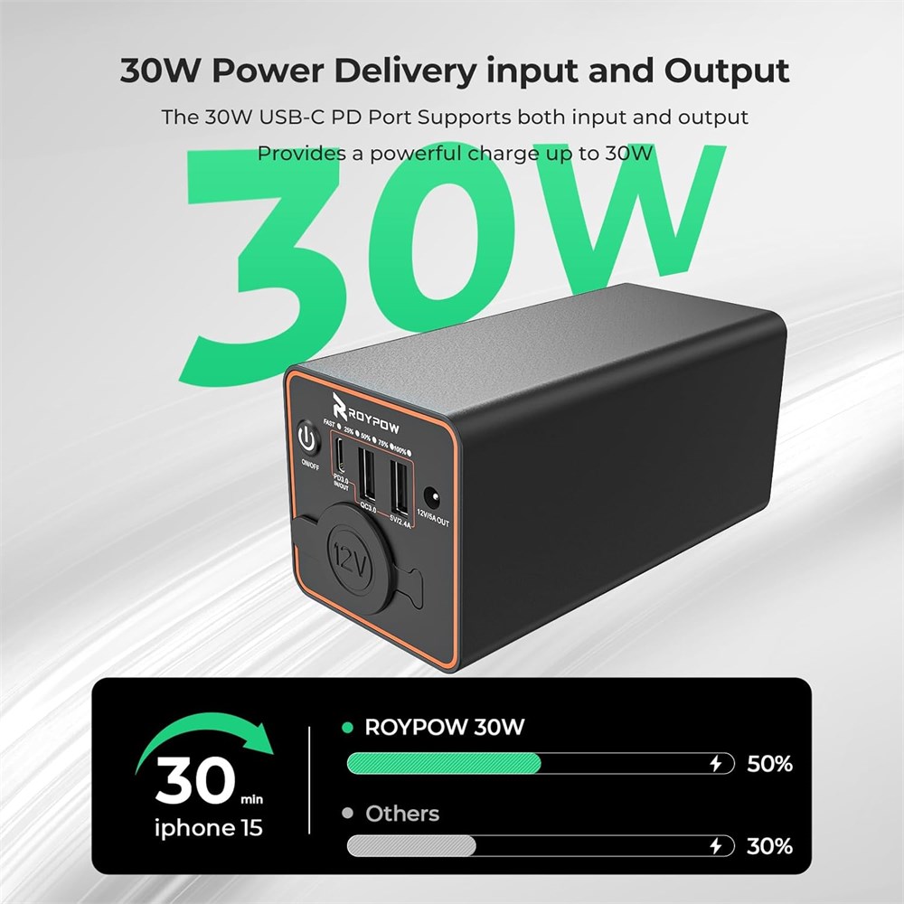 86.58Wh Huge Capacity & Wide Compatibility : This power bank has a total capacity of 86.58Wh, 3.7V @23400mAh or 11.1V @7800mAh super large capacity, which has enough power to keep devices running for days. Weighting 630g and sizing 6.25*6.25*13cm, it is easy to carry and portable to plane or outdoor activities. Featured with 30W USB C PD output, 18W USB A QC 3.0 output, 12W USB-A output, 12V DC output, and 12V cigarette light outlet, this portable power bank can meet the charging needs of different scenarios, such as iPhone, iPad Pro, MacBook, etc. Multiple Protection Functions : RoyPow power bank has a built-in dedicated lithium battery protection chip circuit, and all output ports are equipped with overload protection and short-circuit protection functions. It also has over discharge protection, over voltage protection, over current protection, over heating protection, over charge protection, greatly improves safety. PD 30W Total Output & Input : RoyPow PD power bank is equipped with PD 30W output port, you can charge your MacBook air to 50% in 1 hour by 30W PD output, for iPhone 11 Pro up to 80% in 1 hour, and PD 30W input also allows this power bank to be fully recharged within 3 hours with 30W PD charger. Fast charging speed saves your valued time. 120W Cigarette Lighter Socket & 12V DC Output : Features a unique 120W cigarette lighter socket design and 12V DC output design. 12V/10A car cigarette lighter outlet charges every device which is under 120W (12V 10A), perfect for Car refrigerator, Air compressor, vacuum cleaner. 12V/5A DC output charges your CCTV Camera, router, 12V speaker, christmas lights and so on. NOT FOR 12V air pump!!! Notes : The voltage of the DC port and cigarette lighter fluctuates due to different battery levels, with a normal voltage range of 8.1V -12.6V. When the battery is fully charged, the voltage is12.3V-12.6V. When the battery level is low, the voltage fluctuates with the actual battery level. 5 Powerful Output Ports : (1) 30W USB C PD output; (2) 18W USB A QC 3.0 output; (3) 12W USB-A output; (4)12V DC output; (5)12V/10A cigarette lighter outlet. Multifunctional portable charger, it is perfect to fit on your desk and easy to slide into your bag. It is a powerful battery backup that is lightweight to carry during working, watching, or traveling. Note : Without charging, Qc port will close after the power button turns on for 10 secs. Press button to turn on QC port, it can power again. Package Included : You will get a package including 1 x RoyPow portable power bank, 1 x 3 in 1 cable, 1 x DC cable, 1 x USB A to USB C Cable, 1 x USB C to USB C Cable, 1 x portable bag, 1 x user manual.