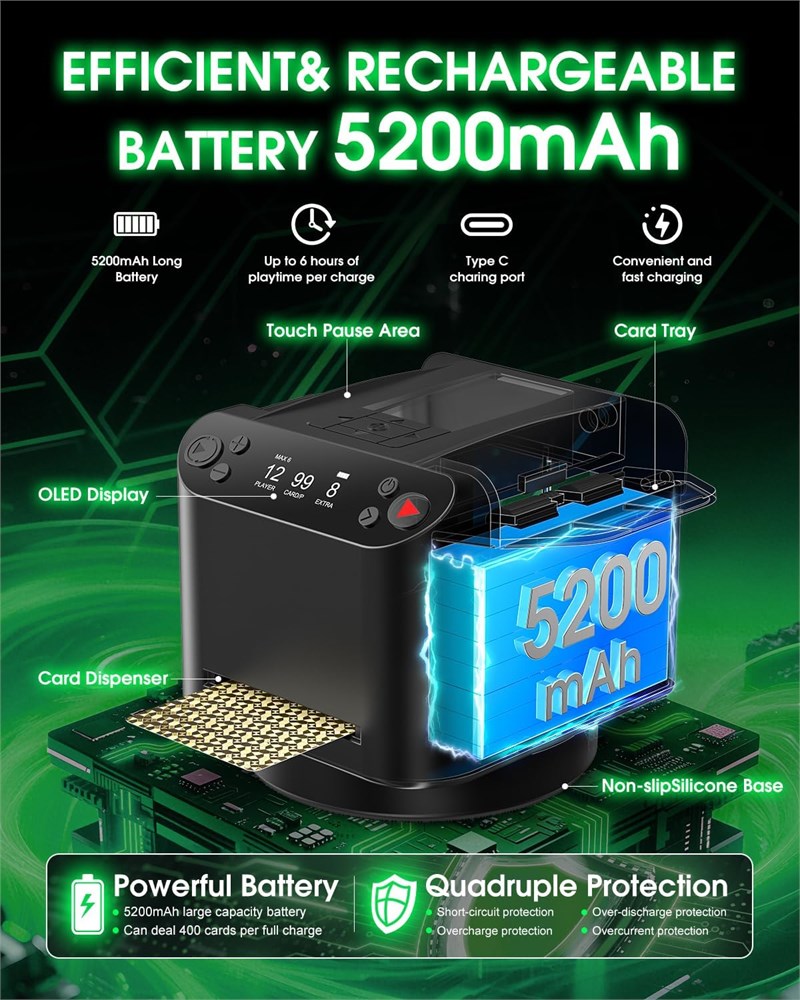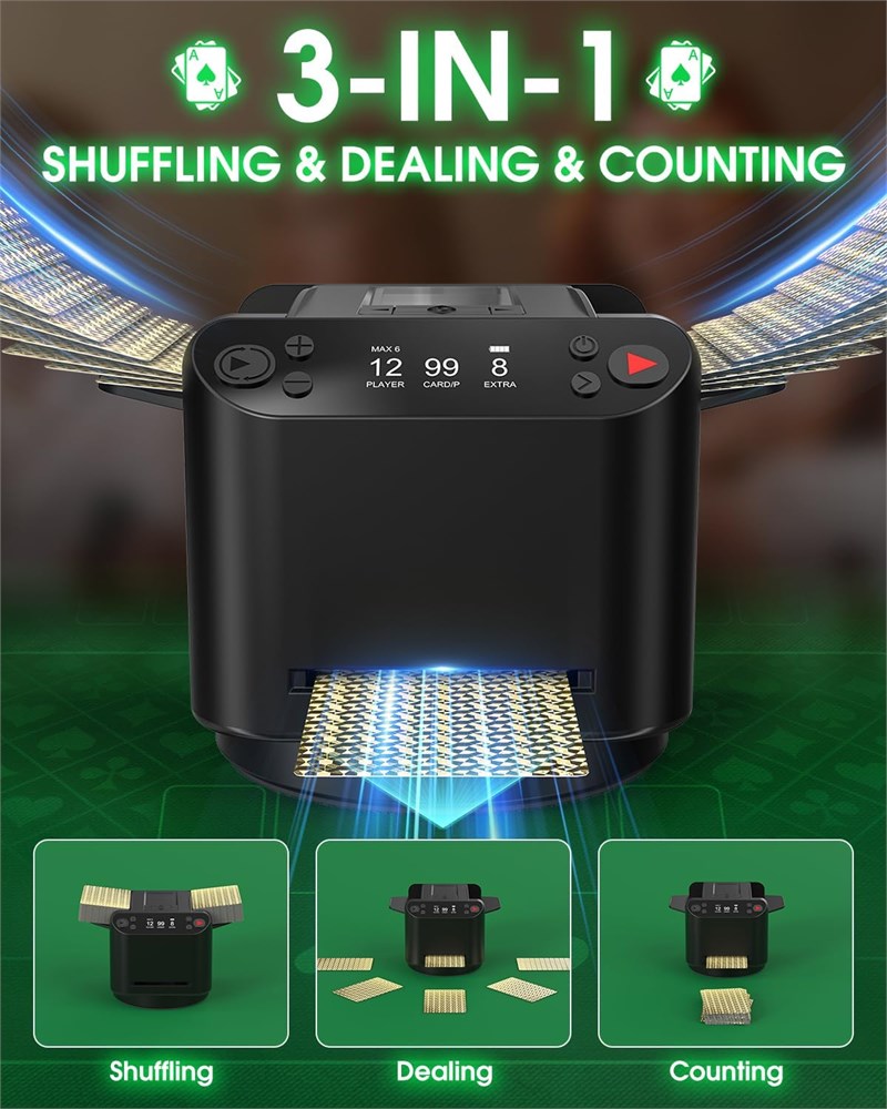 Innovative 3-in-1 Design The upgraded 3-in-1 automatic card shuffler and dealer combines automatic shuffling, dealing, and card counting into one machine. The card dealer machine is perfect for family game nights or parties with friends. Simply set the rules before the game, press a button, and the machine will shuffle and deal cards based on your custom setup eliminating the hassle of manual shuffling and counting, so you can fully enjoy your poker night. 360 ROTATE & OMNI-DISTANCE DEALER The automatic card dealer offers two dealing directions: Back-Forth Deal for 1-8 players; 360 Rotate Deal for 2-12 players. As a smart auto card shuffler and dealer machine, it also provides three distance settings Close, Mid, and Far to fit different table sizes and preferences. This versatile auto card dealer ensures full-range card delivery, ideal for various poker and party games. Customized Gameplay & Easy Dealing The automatic card shuffler and card dealer supports 2-12 players with customizable settings for card count, players, bottom cards, and dealing direction perfect for games like Blackjack, Texas Hold em, Rummy, and Bridge. Comes with 4 card drawing remotes for easy remote dealing just press to draw! For over 4 players, share remotes with neighbors. Enjoy fun, fair play every time. Compatible with Various Card & Touch Pause Sensor The auto card shuffler and dealer machine features retractable card wings to support various card types standard playing cards, UNO, Rummy, Texas Hold em, Bridge, and Blackjack making it the perfect poker night companion. The upgraded card shuffler 2 deck includes a touch sensor for instant pause/resume just tap to stop dealing and tap again to continue without resetting. Quiet, Efficient & Portable The automatic shuffler for cards uses a low-noise motor, shock-absorbing base, and high-quality silicone rollers for ultra-smooth, quiet, and lightweight performance. The automatic card dealer runs silently even during long game nights or parties, creating a calm atmosphere. With a compact build and anti-slip base, it's easy to carry perfect for travel entertainment. Rechargeable & Built to Last The uno card shuffler and dealer features a built-in 5200mAh high-capacity Type-C rechargeable battery. One full charge powers up to 12 hours of use enough to handle 222 decks. Say goodbye to disposable batteries and energy waste. This card shuffler and dealer is ideal for game rooms, poker tournaments, family gatherings, travel, or camping.