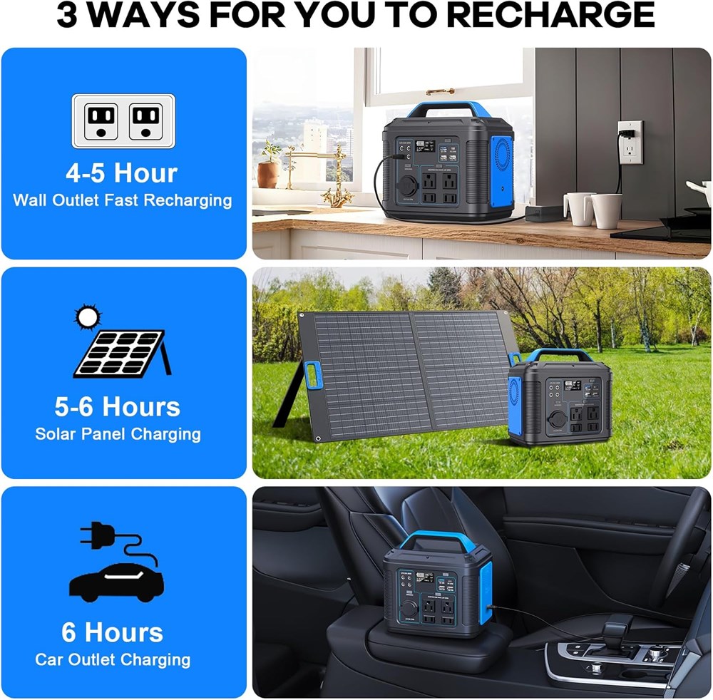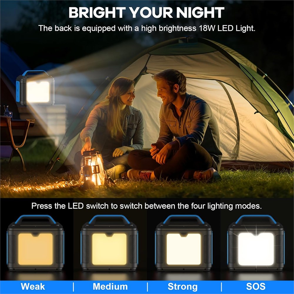 SAFE & STEADY POWER SUPPLY Portable Power Station 300W (Peak 600W) features 4 pure sine wave AC outlets that deliver stable and safe 300W power. great companion for outdoor off-grid activities, 296WH/80000mAh sufficient to power for extending explore nature, camping, travel, hunting, fishing and more, supports most laptops, tablets, phones, lights, fans, projectors, TV, mini-refrigerator, speaker, camera, etc. 13 Output Ports to Meet all Your Needs This outdoor portable power station is equipped with a 296 watt-hour(14.8V 20Ah) lithium-ion battery pack, which features 4* AC outlets(110V Rated 300W - Peak 600W) , 1* PD 100W port, 1* QC 3.0 port, 2* USB-A Ports, 4* DC ports and 1* DC car socket. It provides 13 power output ports to charge multiple devices at the same time, such as laptop, phone, drone, car fridge and cameras, etc. Outdoor Backup Power Designed lightweight-just 6.6 lbs and has a solid handle for easy to carry. Equipped with an 18W bright emergency flashlight on the back, which can project a powerful beam of up to 500 meters and is suitable for large-area lighting. It is perfect for outdoor camping and disaster prevention. There are 4 lighting modes you can easily switch (weak medium strong SOS). Fast Charging Technology You can recharge your power station with an AC adaptor when at home, Wall Outlet about 4-5 Hrs.Use car charging and solar panel charging when going out.Solar Panel(60W) about 5-6 Hrs/Car Outlet about 6 Hrs(Solar panel is not included) Excellent Safety BMS Not only will the solar generator automatically stop charging any device when it's full, it will also offer short-circuit and power-surge protection for electronics that constantly need electricity.The same battery management system comes into play when charging the generator with solar power, ensuring none of the circuits get fried.