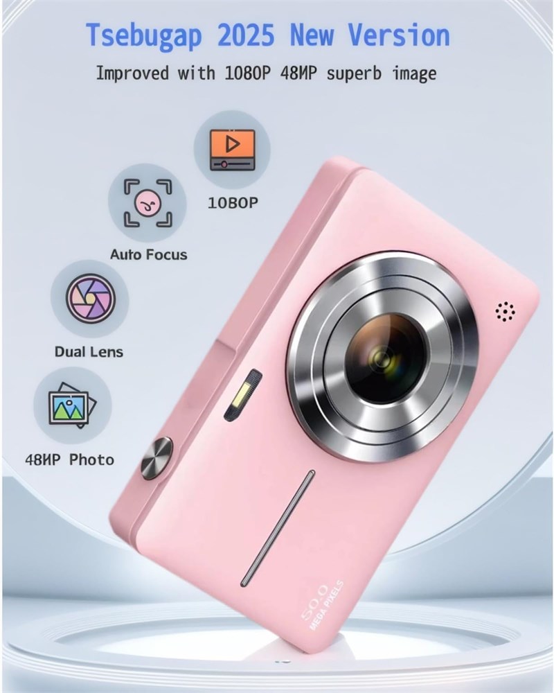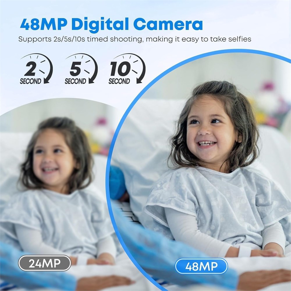 1080P HD & 48MP The Digital Camera easy-to-use with Capture life's moments in stunning 1080P HD video or 48MP high-resolution photos Point-and-shoot digital camera with a fixed lens, fast focus, 200-degree wide-angle field of view, ensures smooth and clear images every time you shoot. Fun Photography This fun-filled camera for kids inspires creativity with 8 unique filters, 9 special effects, and 18 fun frames. It also features built-in games that encourage imagination and make every photo session fun. Lightweight & Portable Compact and lightweight, this digital camera for kids is perfect for little hands and on-the-go adventures. It includes a large-capacity battery and smart auto sleep/shut-off to conserve power, providing long-lasting fun without frequent charging. Accessories Get everything you need right in the box: digital camera,1* memory card, card reader, adapter, and Lanyard. This complete kit means no extra purchases it s ready to use straight out of the box. Prefect Gifts Beautifully packaged, this digital camera for kids makes a wonderful gift ideal for birthdays, holidays, or as a creative reward. It s a practical and exciting present that inspires kids to explore photography and capture their world.