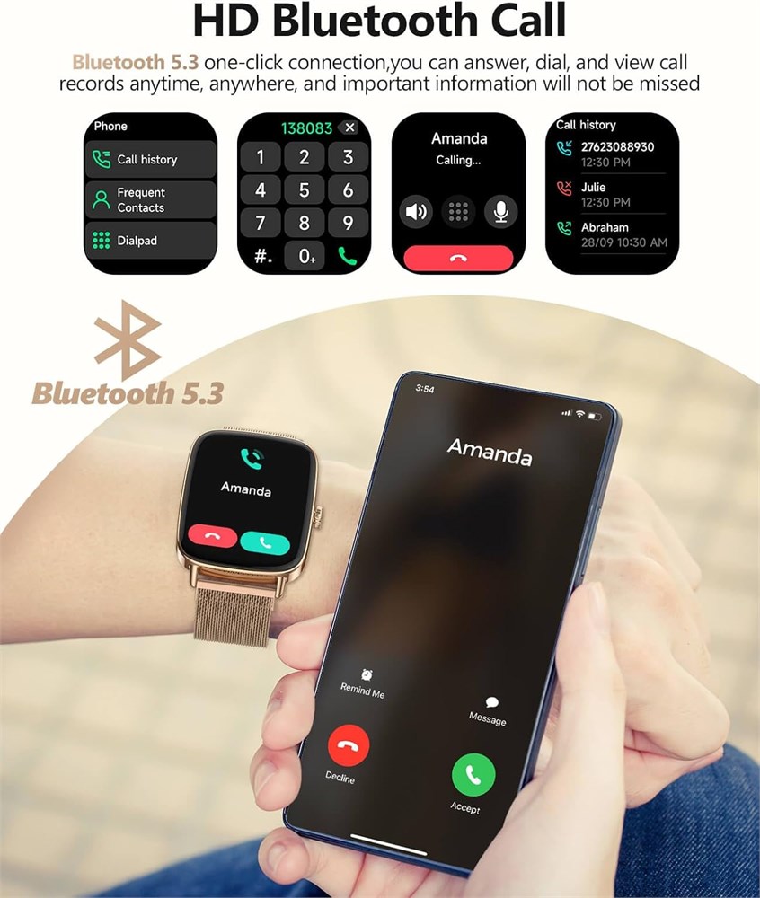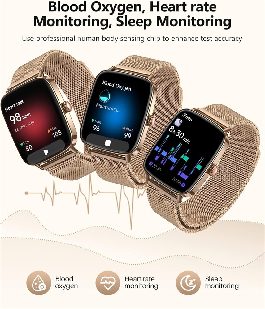 Military-Grade Protection and Lightweight Design Military-Grade Material Combination : The zinc alloy frame (with an impact resistance of 800 MPa) is paired with scratch-resistant glass, passing a 10-meter drop test and a 50 kg compression certification, surpassing the MIL-STD-810G standard. The watch body weighs only 32.8 grams, and is equipped with skin-friendly silicone or magnetic alloy straps, suitable for both mountain climbing and business meetings. All-Terrain Conqueror, A Reliable Partner in Extreme Environments Extreme Environment Adaptability : It operates within a wide temperature range of -20 C to 50 C, with normal screen touch control in -20 C snow skiing and stable, non-lagging performance in 50 C desert conditions. With IP68-level waterproofing and dustproofing, you can answer calls while showering, navigate in heavy rain, with water droplets sliding off the screen like a lotus leaf effect, ensuring zero risk of sweat corrosion. Health Monitoring System PPG sensor captures heart rate at 120Hz, enabling AI-powered arrhythmia alerts (95% accuracy, 7-day continuous reports). SpO monitoring achieves 2% precision vs. 5% industry standard. Features <10 min sleep stage error, female cycle prediction & symptom analysis. Multi-dimensional biometric fusion enables sensation-free health risk assessment. Professional Sports Analysis and Training Optimization With our Smart Watch's intelligent recognition system, you can easily record detailed data for various sports, including calorie consumption, step frequency, distance, heart rate, and exercise duration. Whether for daily exercise or professional training, we provide precise sports analysis and optimization suggestions to help you easily achieve your health goals. Making every workout more efficient and scientific! Smart Ecosystem and Interactive Innovation Invoke Siri and Google Assistant via BT for convenient AI voice control. Dual microphones enhance noise reduction, improving command recognition by 30% in noisy environments. Answering and making calls are effortless, with real-time access to various short messages. Your health manager intelligently reminds you to drink water, take breaks from sitting, monitor blood oxygen and stress abnormalities, and provides synchronized care for female cycles. Ultra-Long Battery Life and Energy Management Battery Technology : A 350 mAh lithium-polymer battery balances performance and endurance, providing 7-10 days of regular use, with a low-power mode offering 30 days of standby time. Magnetic fast charging fully charges in 2 hours, and a 10-minute charge supports 24 hours of use. Compatibility : The watch supports BLE 5.3 Bluetooth version, ensuring stable data transmission and compatibility with IOS 12.0+ and Android 6.0+ systems. Technology and Aesthetics on Your Wrist OTA Updates : New features are automatically downloaded - wake up each month to see a smarter watch. App Ecosystem : Download watch faces (including Star Wars and Marvel themes!) and mini-games. Customizable AF : Match the watch face to your outfit, mood, or the latest Instagram aesthetics.