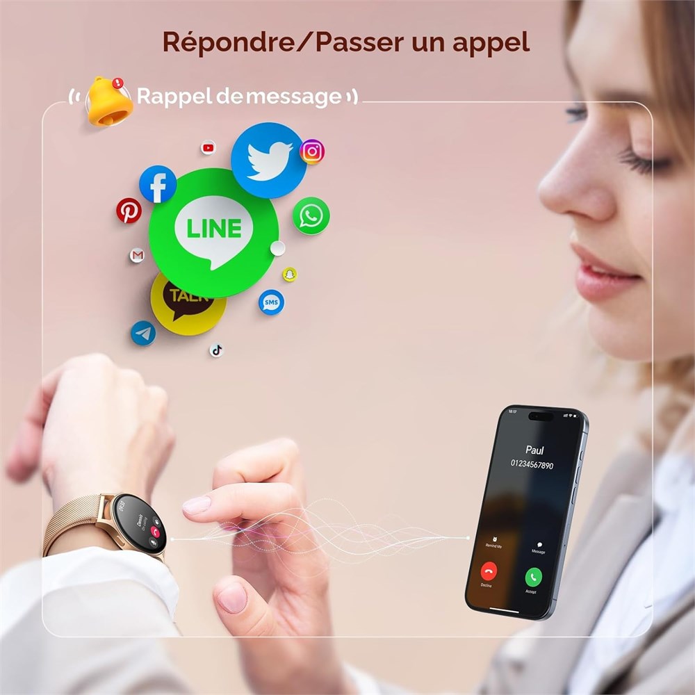 Crystal-Clear Communication : la montre intelligente AEAC offre une qualit d appel claire gr ce des haut-parleurs et des microphones haute d finition. Con ue avec un assistant d IA, elle permet des commandes vocales fluides et des appels mains libres. Surveillance compl te de la sant : la montre intelligente AEAC suit des param tres de sant essentiels Taux d oxyg ne sanguin, fr quence cardiaque, stress et analyse du sommeil Vous fournissant des informations pr cieuses pour am liorer le bien- tre. Batterie longue dur e : profitez jusqu 10 jours d utilisation avec une recharge rapide de 2 heures. Elle surveillera votre fr quence cardiaque, vos pas, vos parcours d activit et les calories br l es en continu, offrant une vue compl te de votre sant et de votre condition physique. Plus de 110 modes sportifs et tanche : avec plus de 110 modes sportifs, cette montre de mise en forme prend en charge un large ventail d activit s, du yoga la natation. Sa conception r sistante l eau 3 ATM assure une performance fiable dans des conditions humides. cran tactile AMOLED de 1,32" : l affichage offre des visuels nets et une r activit fluide. Choisissez parmi plus de 200 cadrans de montre ou personnalisez-la avec vos propres photos, rendant la montre v ritablement unique.