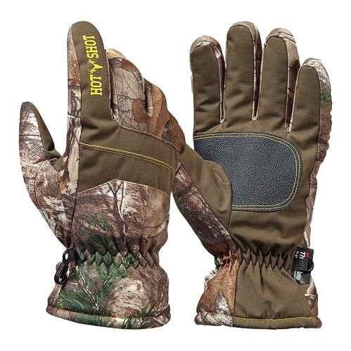 Hot Shot Men's Defender Insulated Tricot Hunting Gloves Men's Defender F 100% polyester brushed tricot gloves, lined with 40 grams of 3M Thinsulate Insulation, 100% polyester tricot lining, waterproof insert, sure grip palm patch, contrast colored stitching, pre-curved fingers, poplin insert on back of hand, poplin palm, color blocking on back of hand, and a double row elasticized wrist. 100% polyester brushed tricot 40 grams of 3M Thinsulate Insulation 100% polyester tricot lining Waterproof insert Sure grip palm patch.